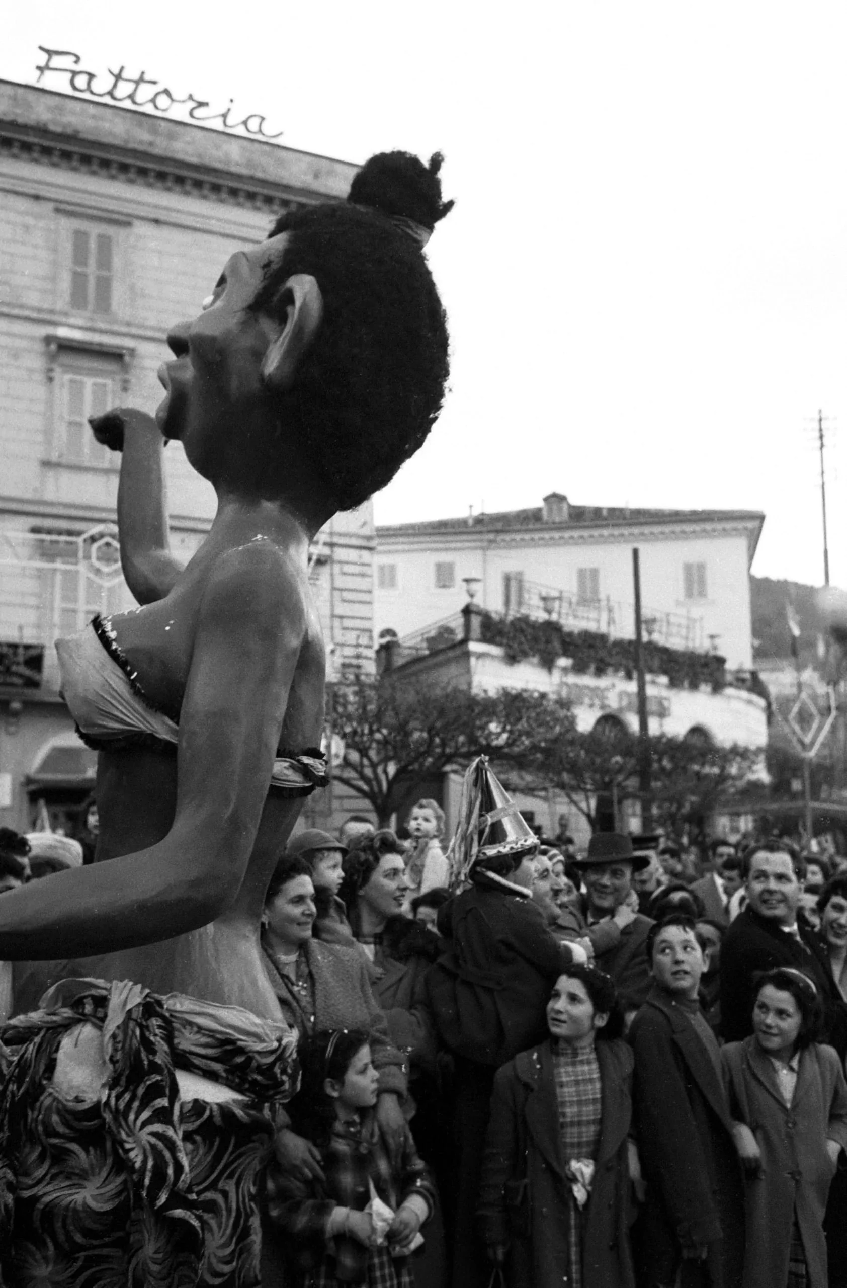 Black and white photograph of an oversized carnival float figure of a woman in profile towering over a winter-dressed crowd in an Italian town square