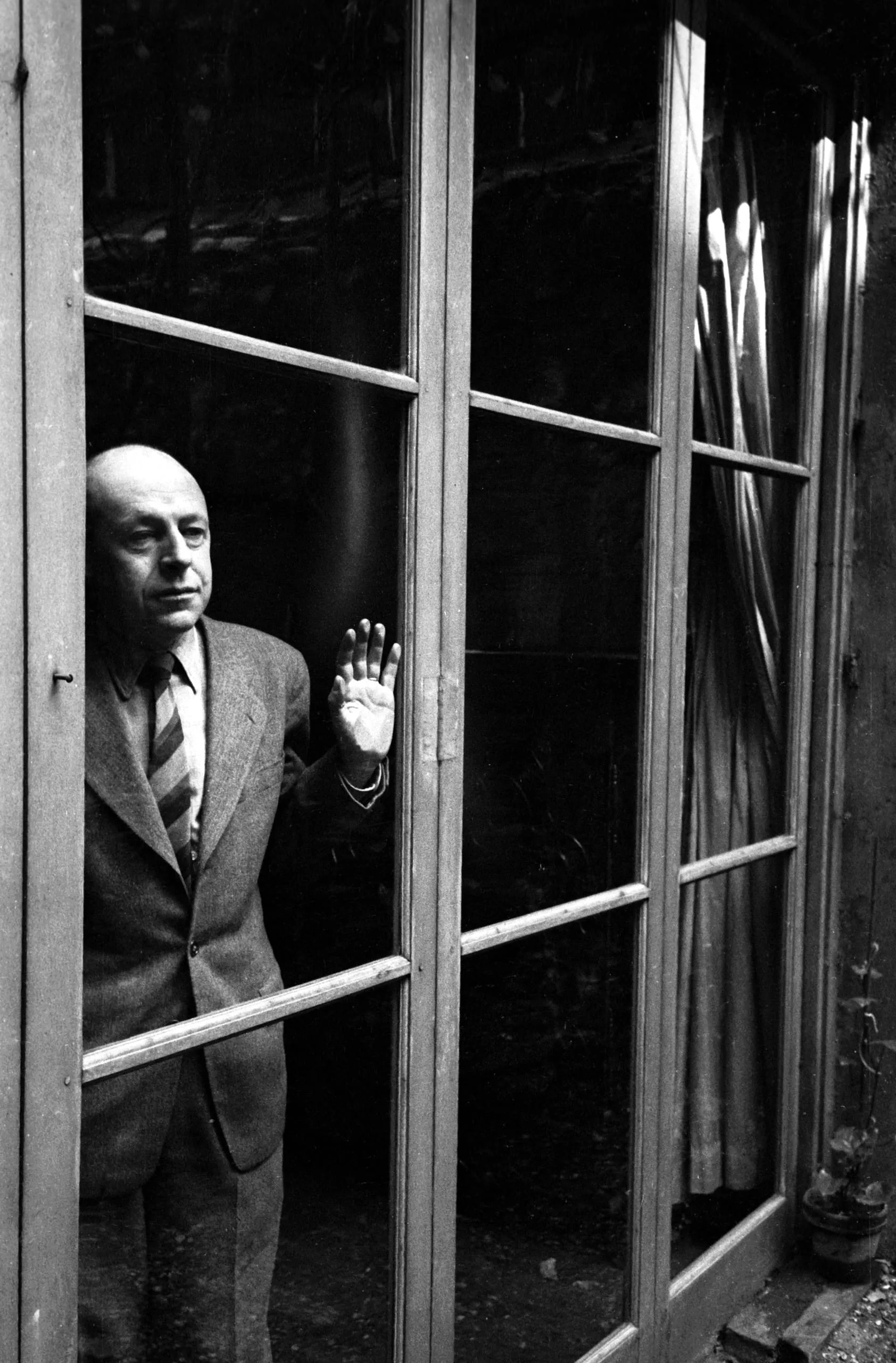 Black and white photograph of a bald white man in a suit, standing behind a multi-paned glass door with one palm pressed flat against the glass