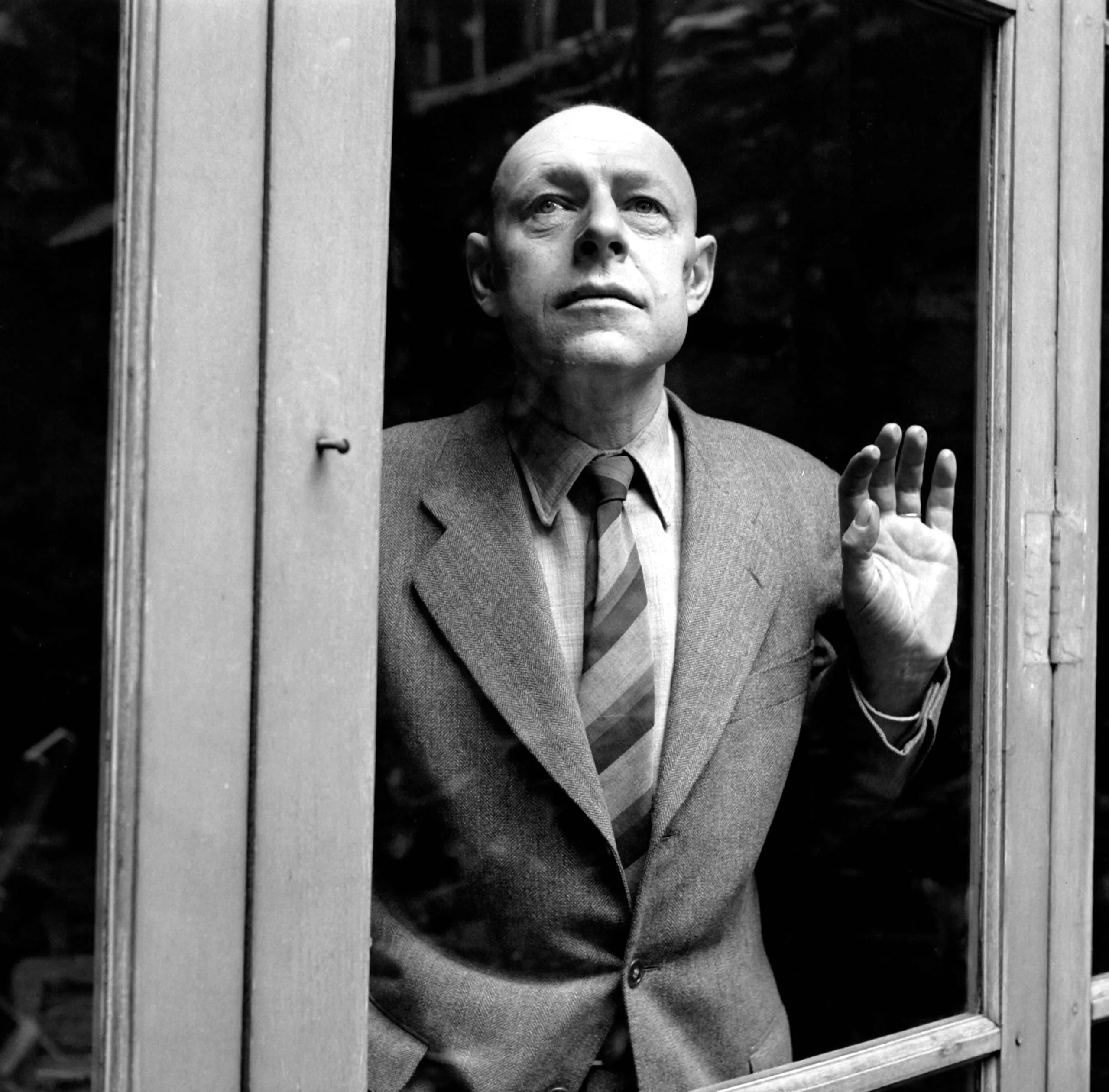 Black and white photograph of a bald white man in a gray suit and striped tie, seen from the waist up through a wooden window frame, one hand pressed against the glass, looking upward