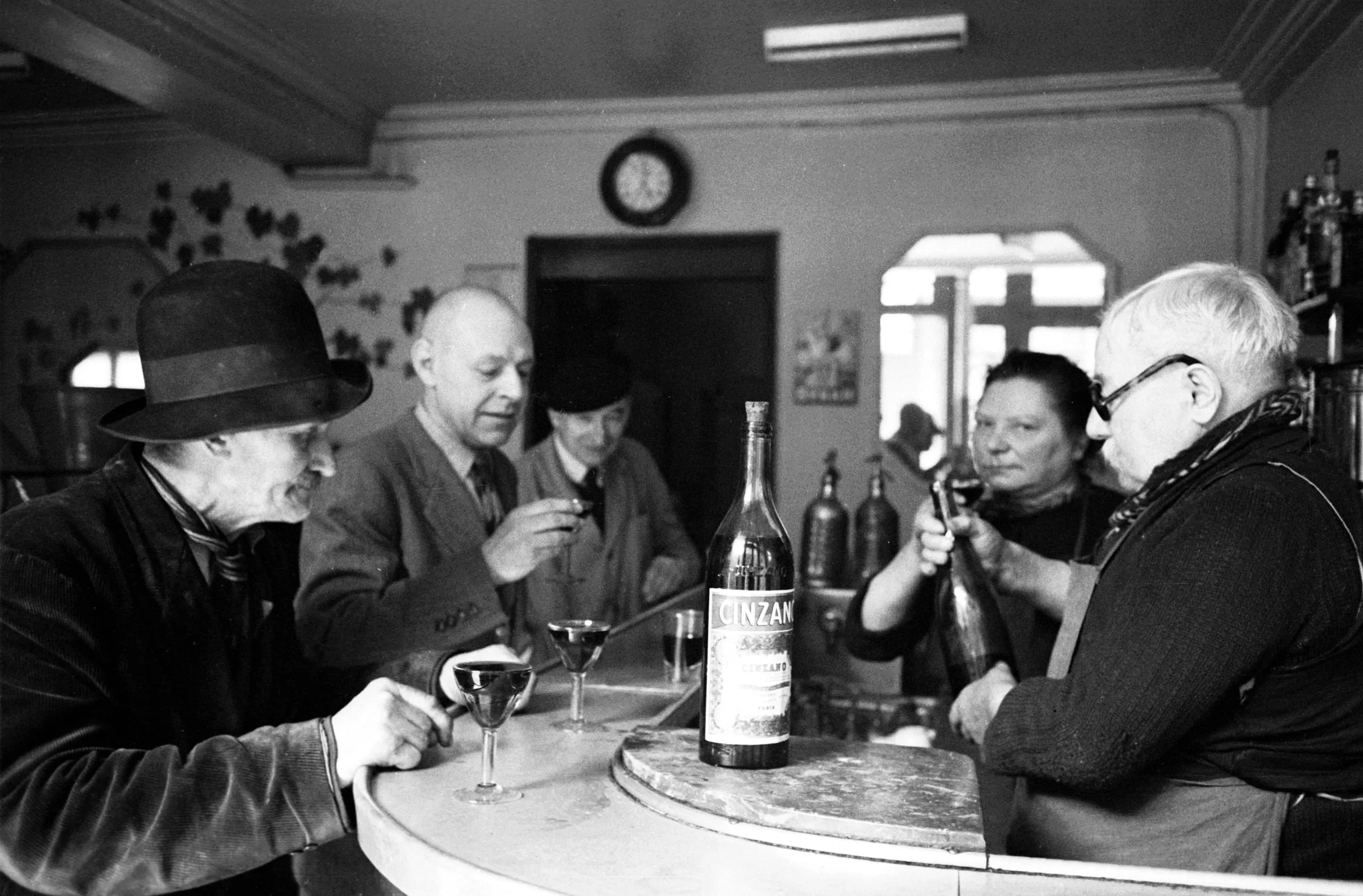 Black and white photograph of five people gathered around a round bar counter with a Cinzano vermouth bottle and stemmed glasses, interior bar setting