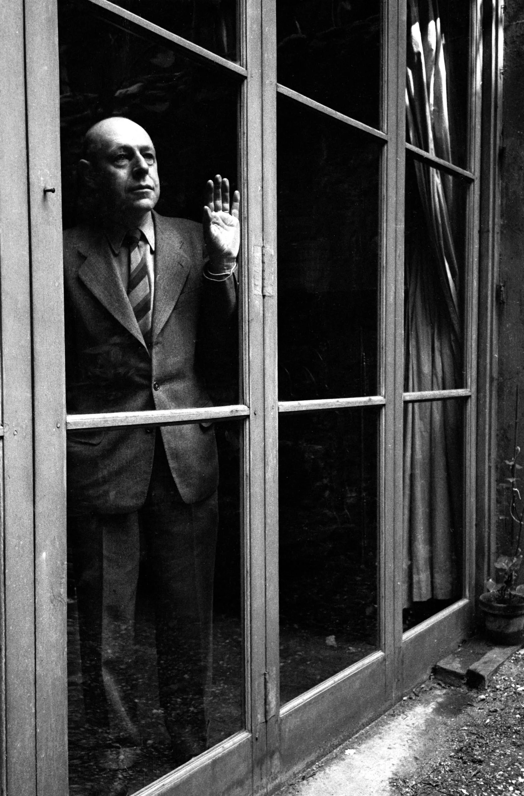 Black and white photograph of a bald white man in a suit standing behind multi-paned French doors, right palm raised toward the glass