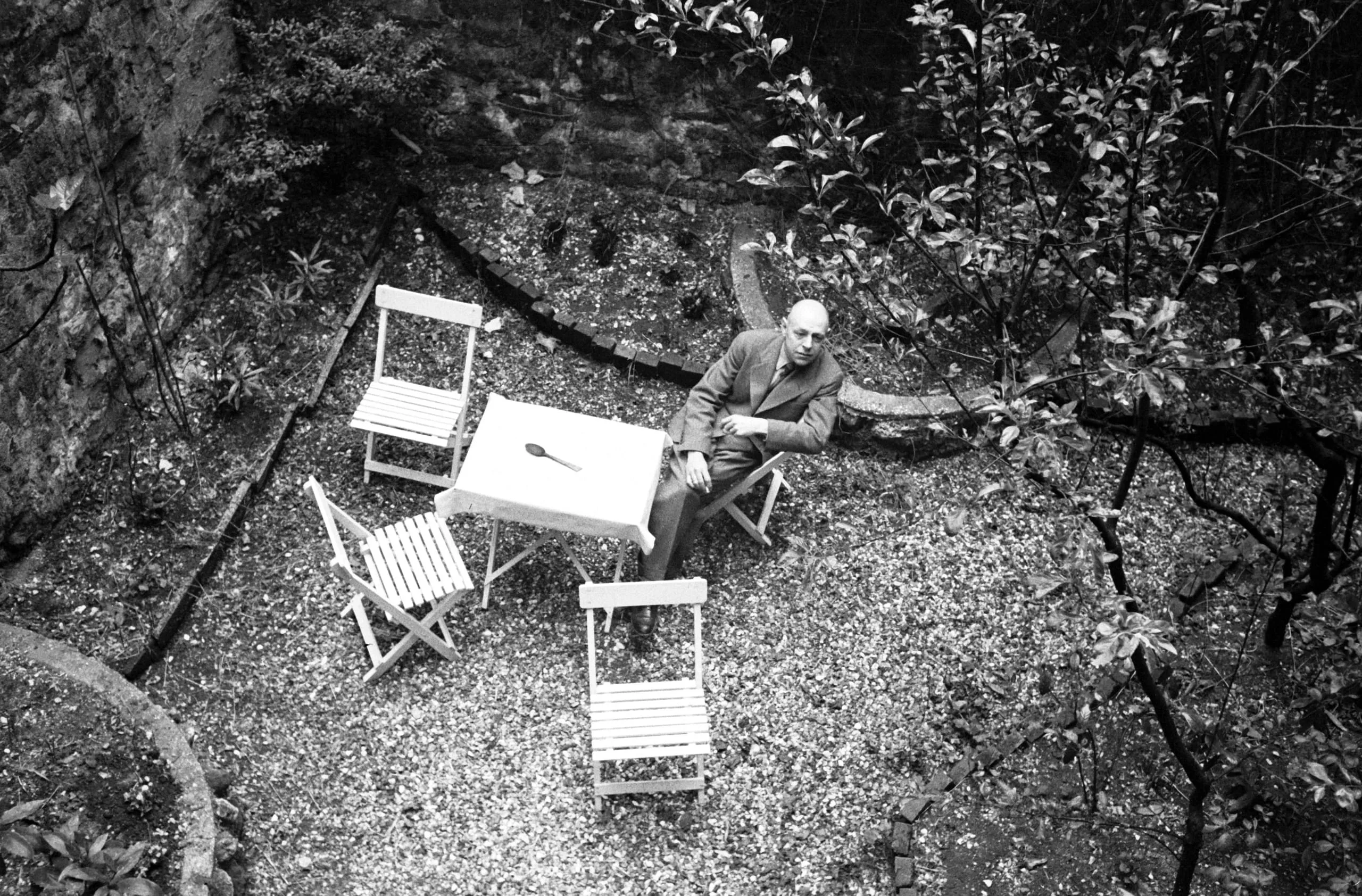 Black and white photograph shot from above, a bald man in a dark suit seated at a small white folding table surrounded by three empty chairs on a gravel surface