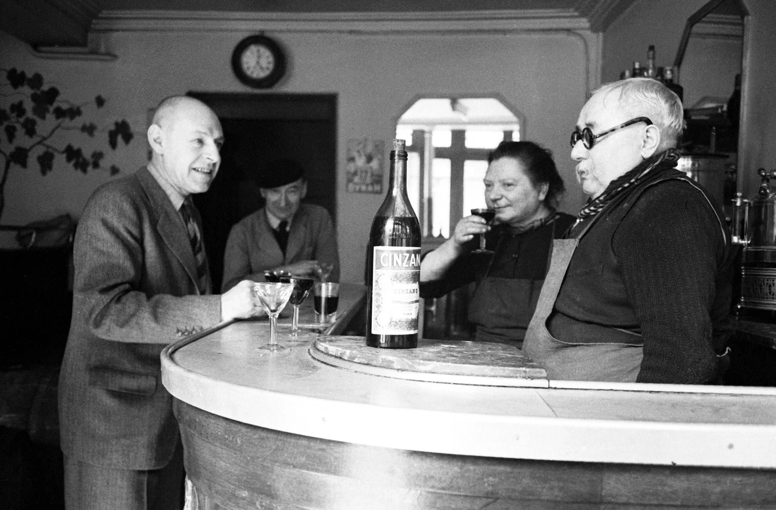Black and white photograph of four people gathered around a curved bar counter with a Cinzano bottle and wine glasses, in a small pub interior