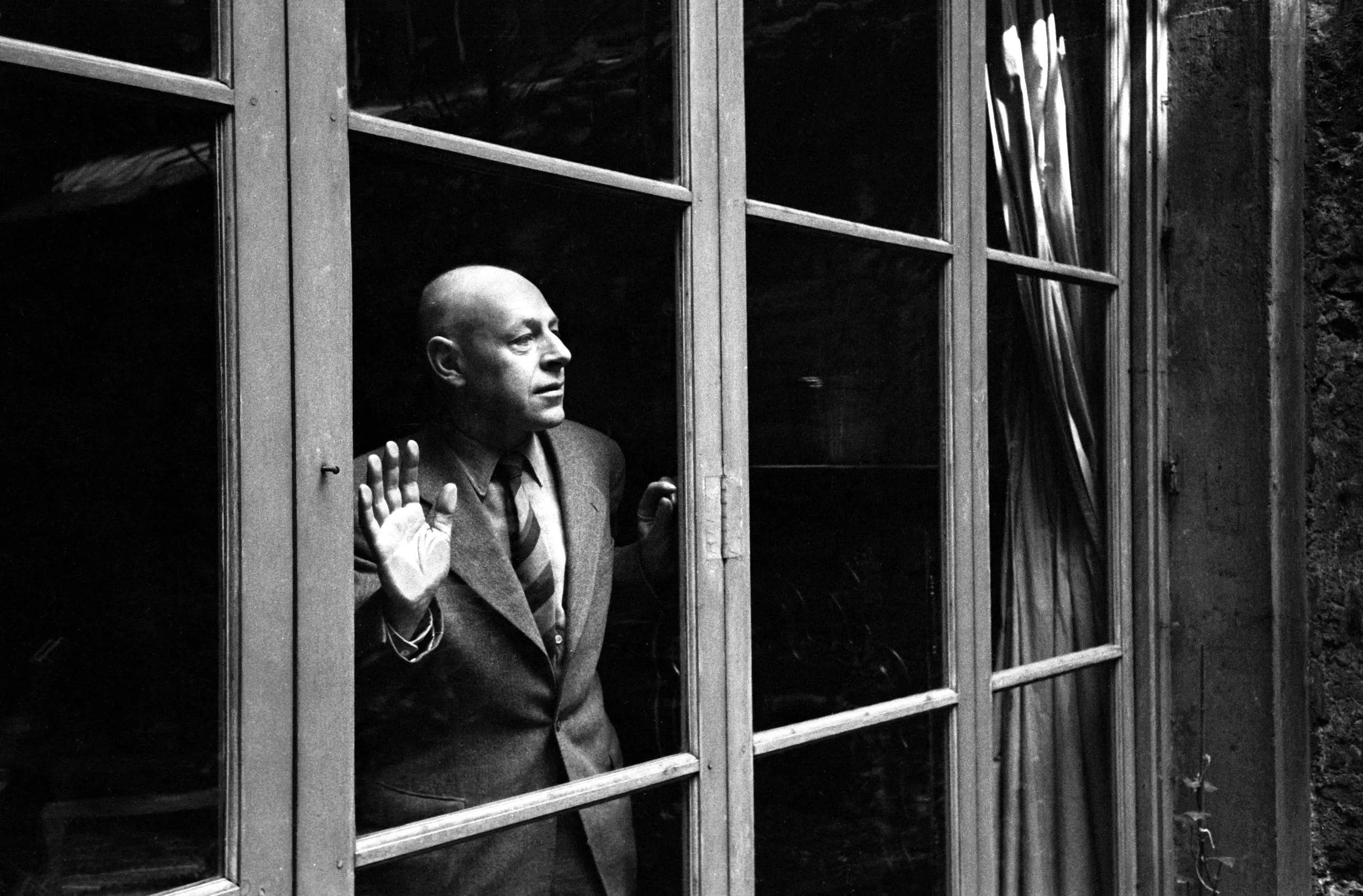 Black and white photograph of a bald man in a suit jacket pressing one hand flat against a multi-paned glass door, viewed from outside