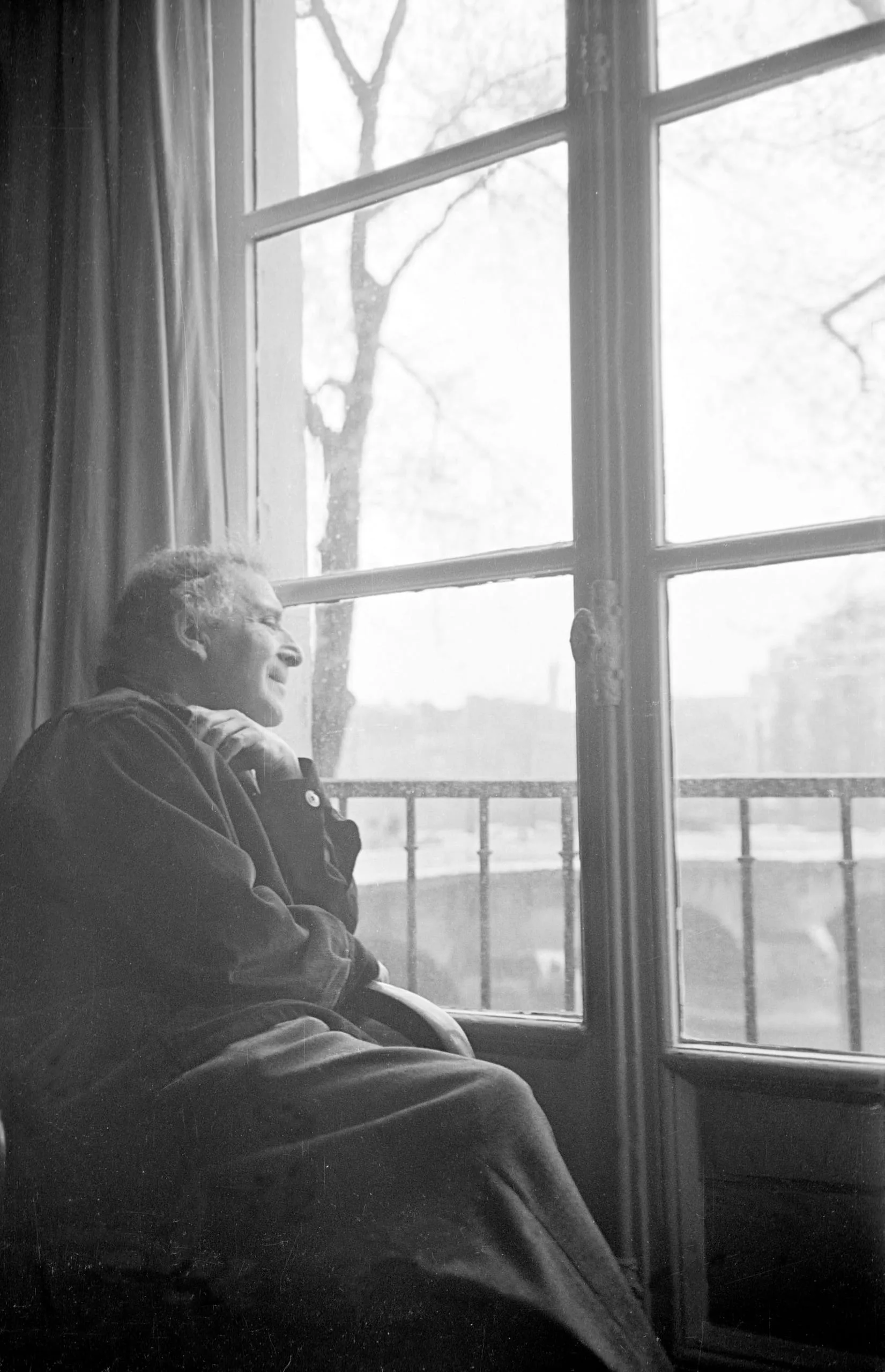 Black and white photograph of a person with short gray hair seated in profile near a multi-pane window, face tilted upward with lips parted, backlit by soft daylight