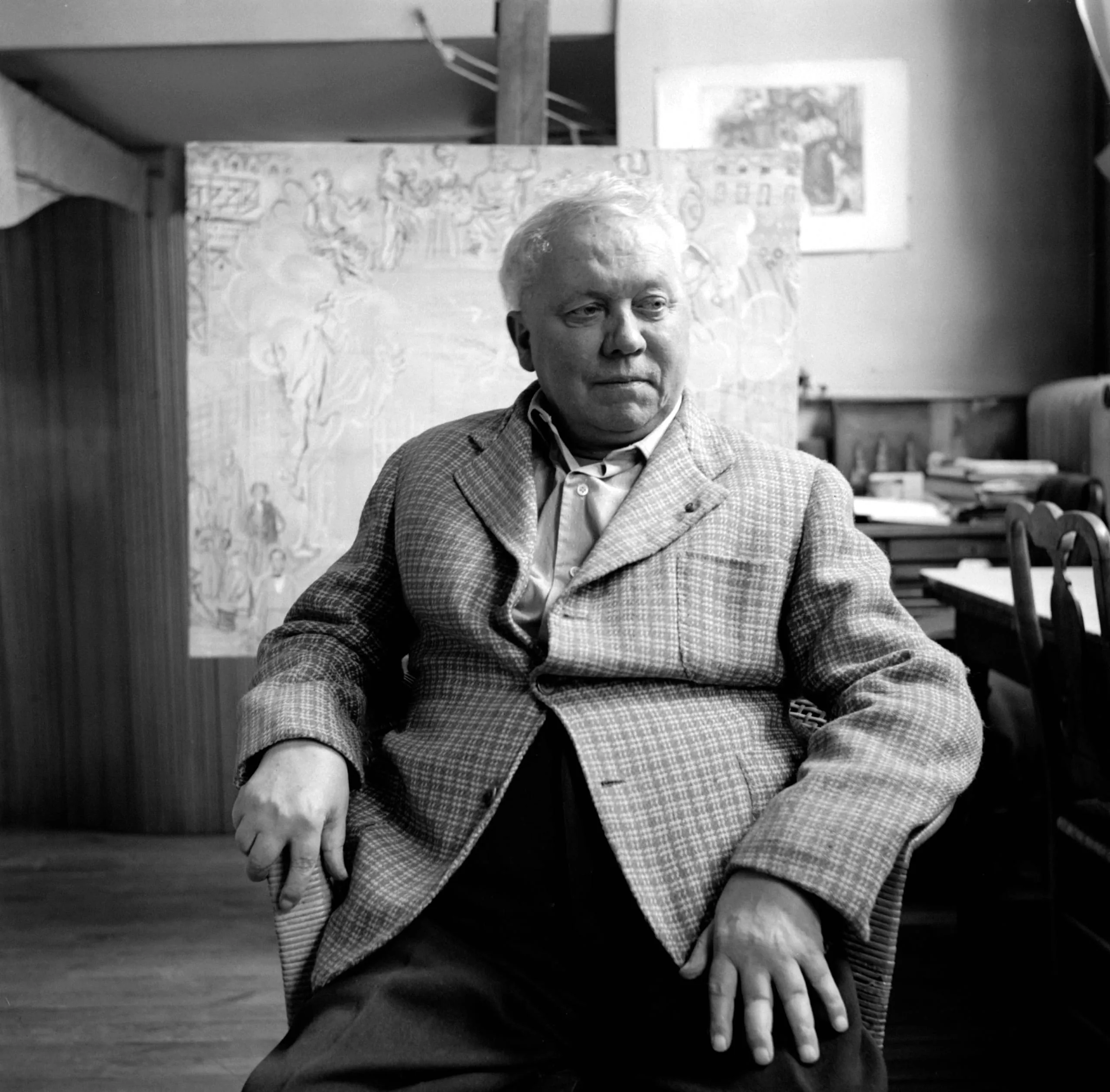 Black and white photograph of a heavyset white man with white hair, seated in a chair wearing a plaid sport coat, with large-scale figure drawings visible on the wall behind him
