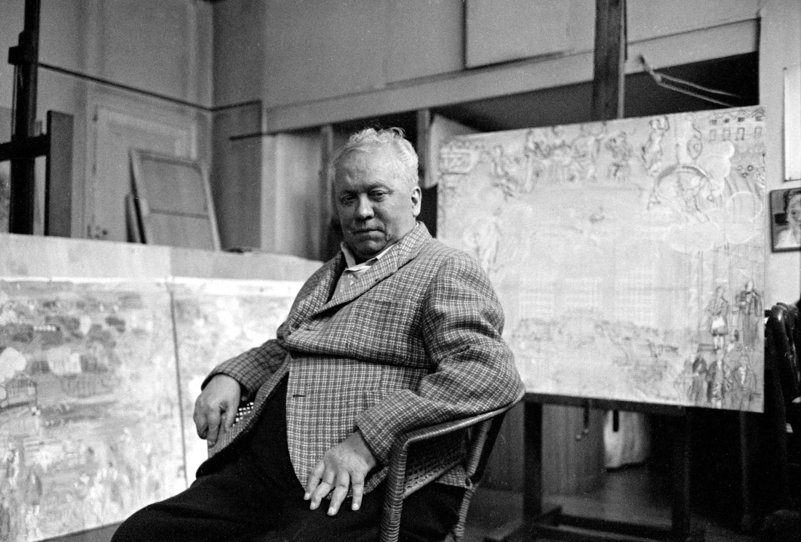 Black and white photograph of a heavyset man in a plaid jacket seated in a metal chair inside an artist's studio, surrounded by large painted canvases