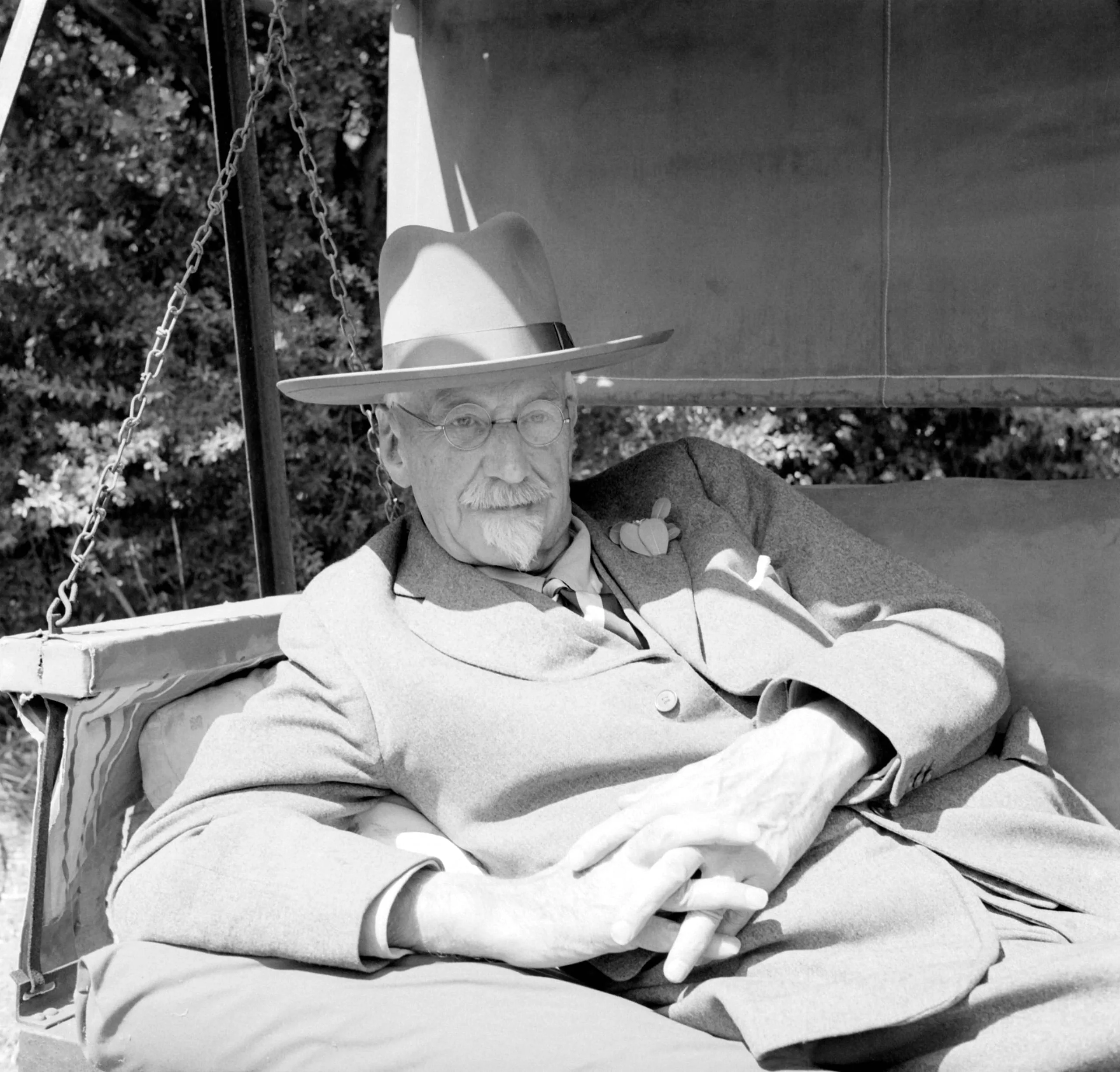 Black and white photograph of an elderly man reclining in a hanging outdoor seat, wearing a wide-brimmed hat, round glasses, and a loose overcoat, holding a cigar