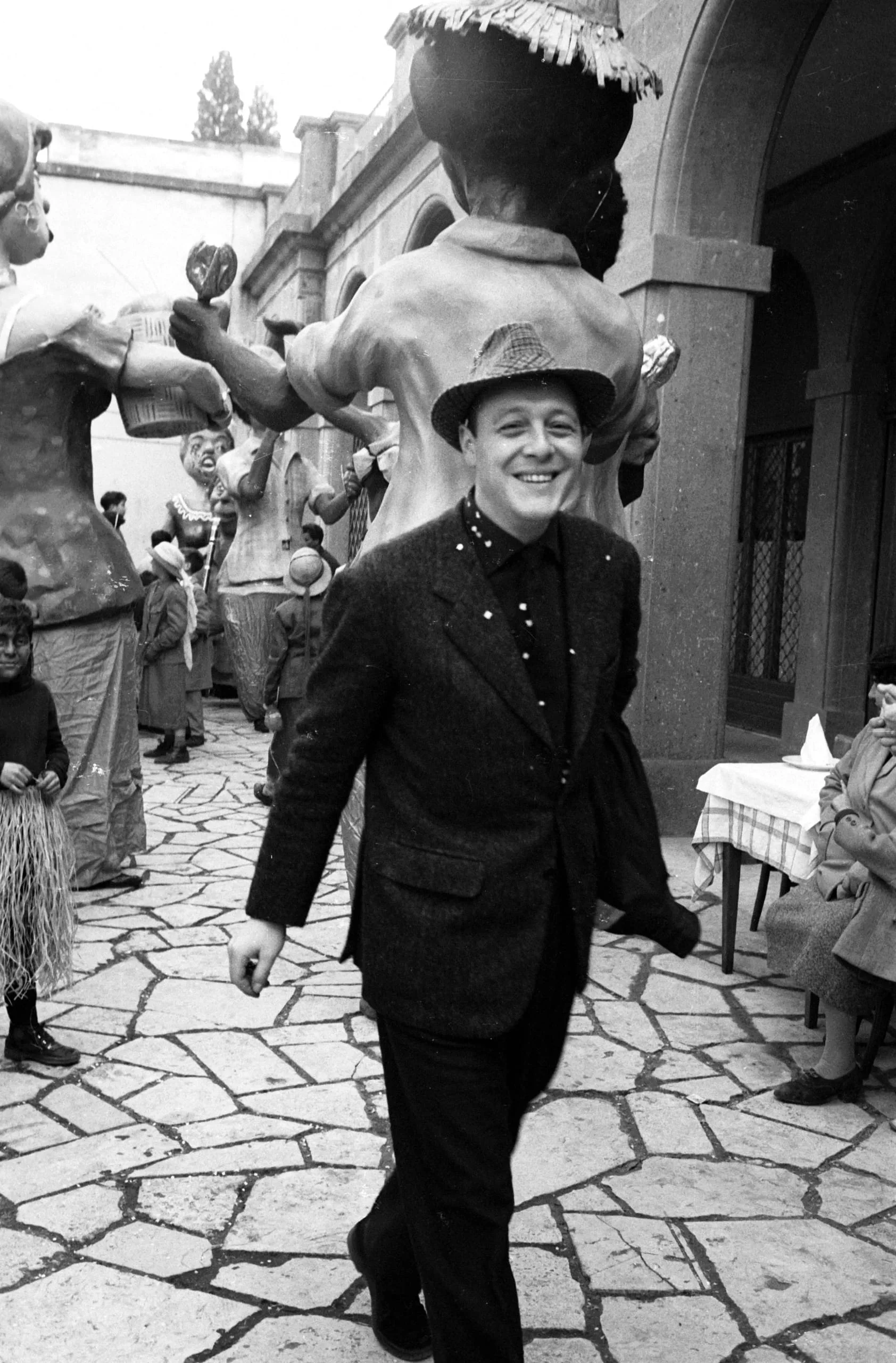 Black and white photograph, full-length view of a smiling man in a speckled dark blazer and wide-brimmed hat walking toward the camera, with large carnival figures and costumed participants in a stone courtyard behind him