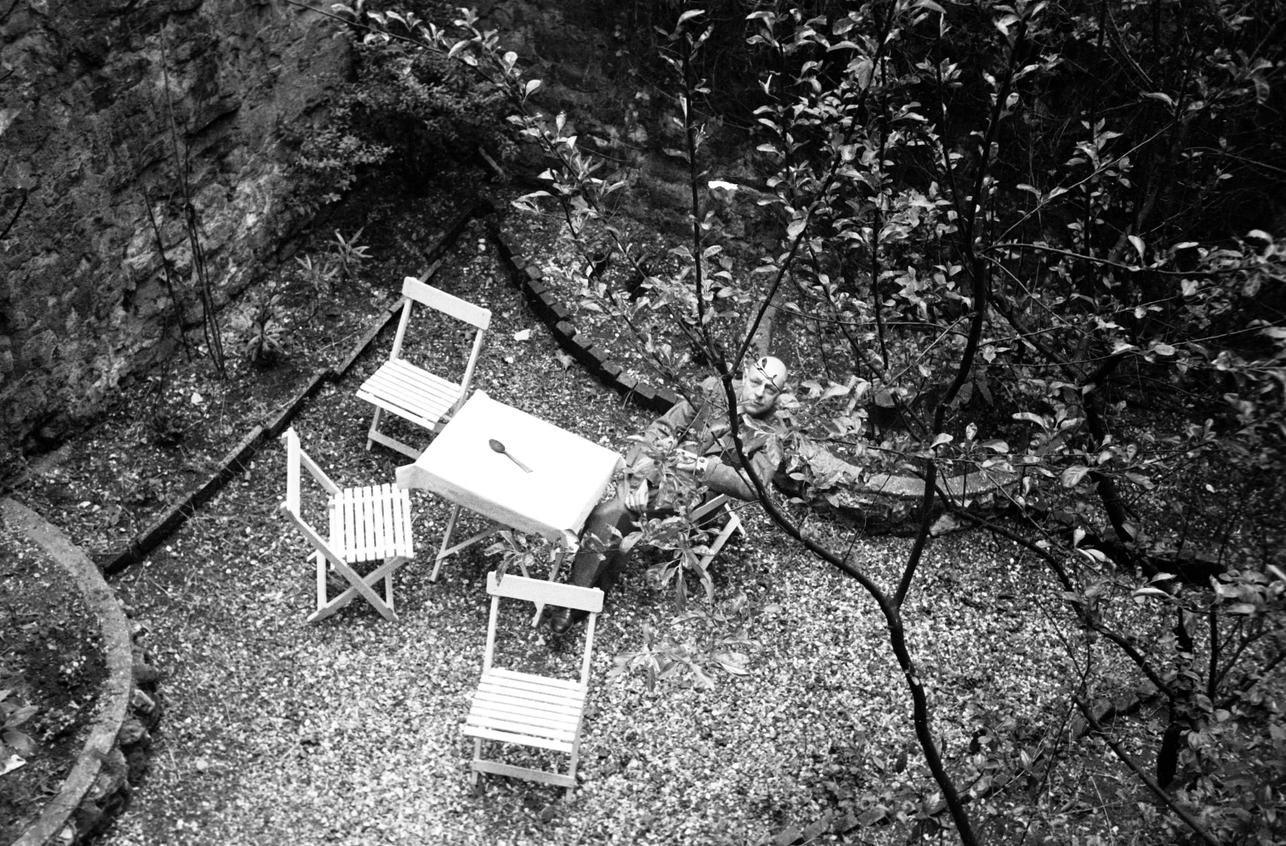 Black and white photograph shot from above, looking down onto a gravel courtyard with a white folding table, three white chairs, a spoon on the table, and a person crouching among surrounding shrubs