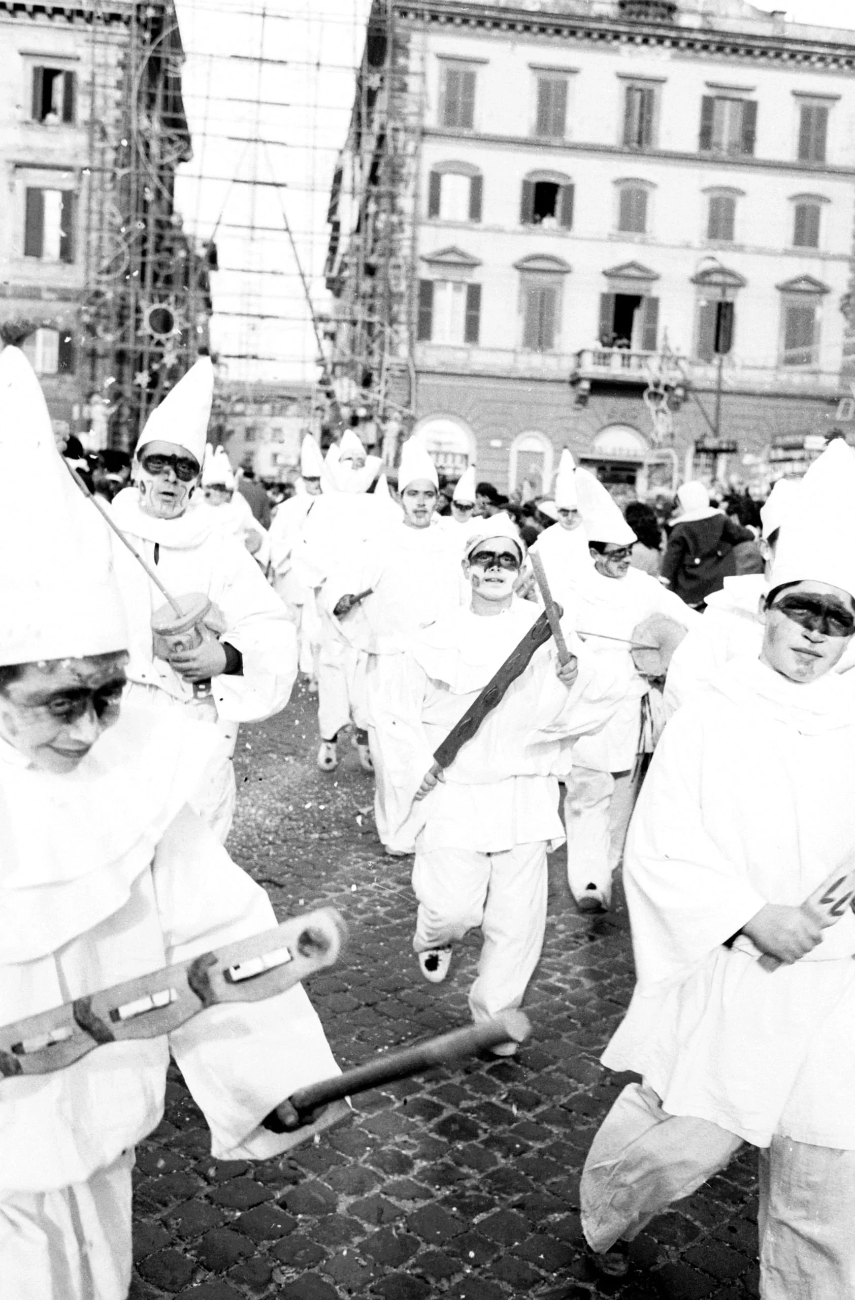Black and white photograph of a large crowd in white conical hats, white costumes, and dark eye masks processing across a cobblestone plaza, several carrying wooden poles
