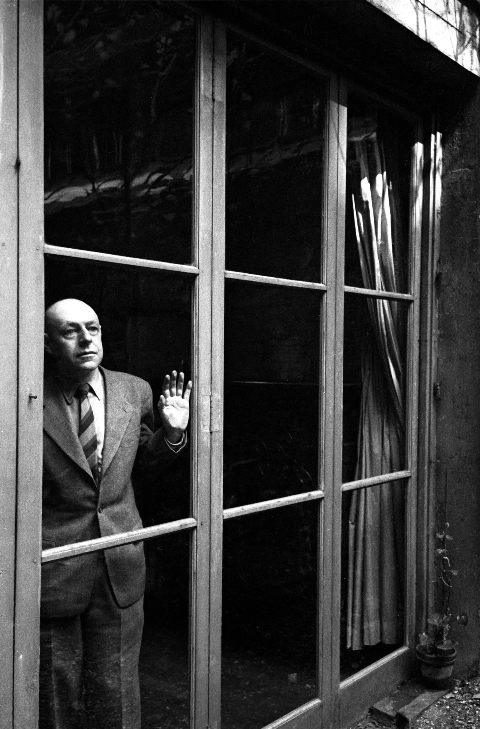 Black and white photograph of a bald white man in a suit pressing his palm against the glass of a multi-paned French door, viewed from outside