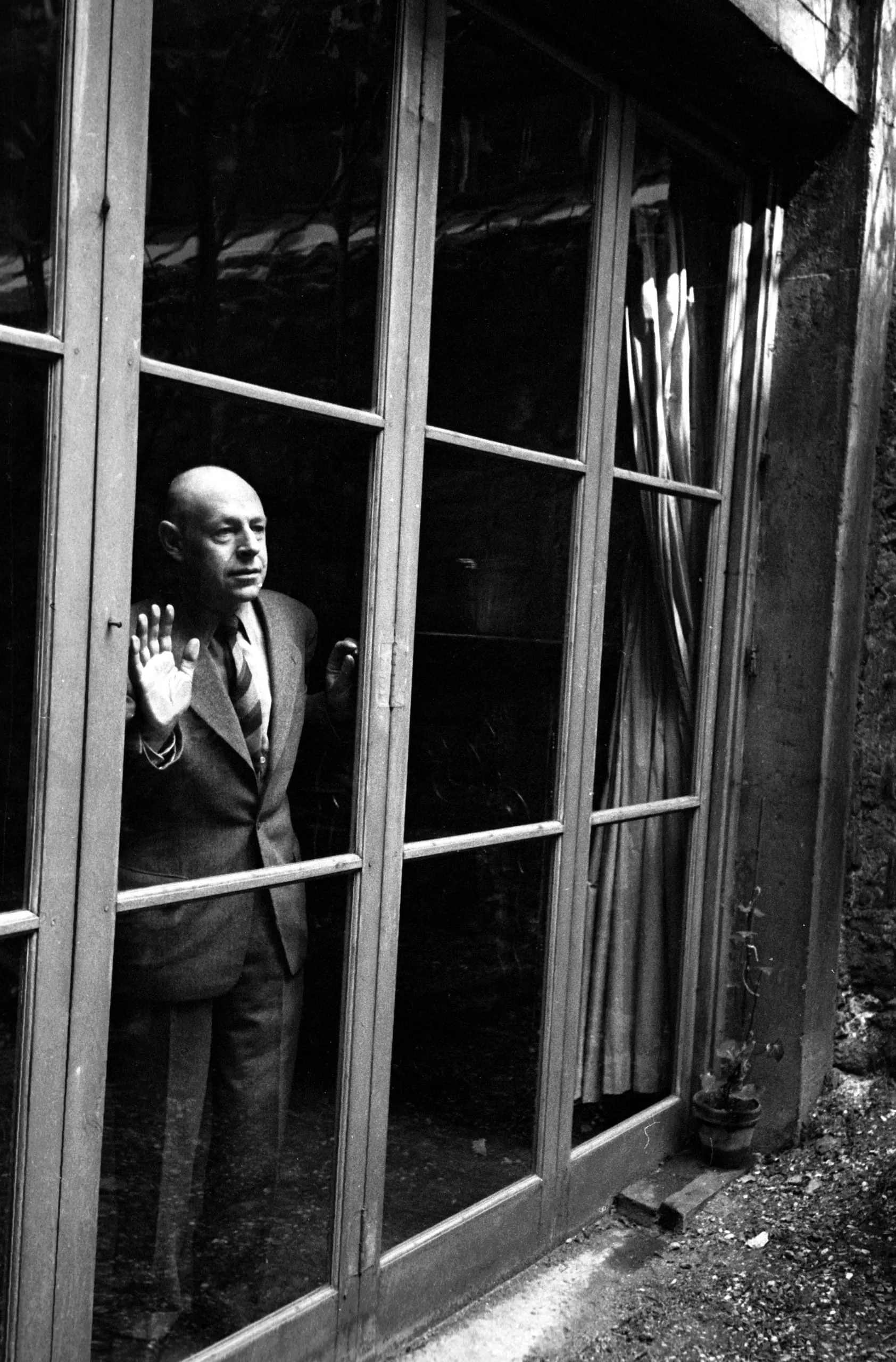 Black and white photograph of a bald man in a dark suit pressing his palm to the glass of tall French doors, viewed from outside
