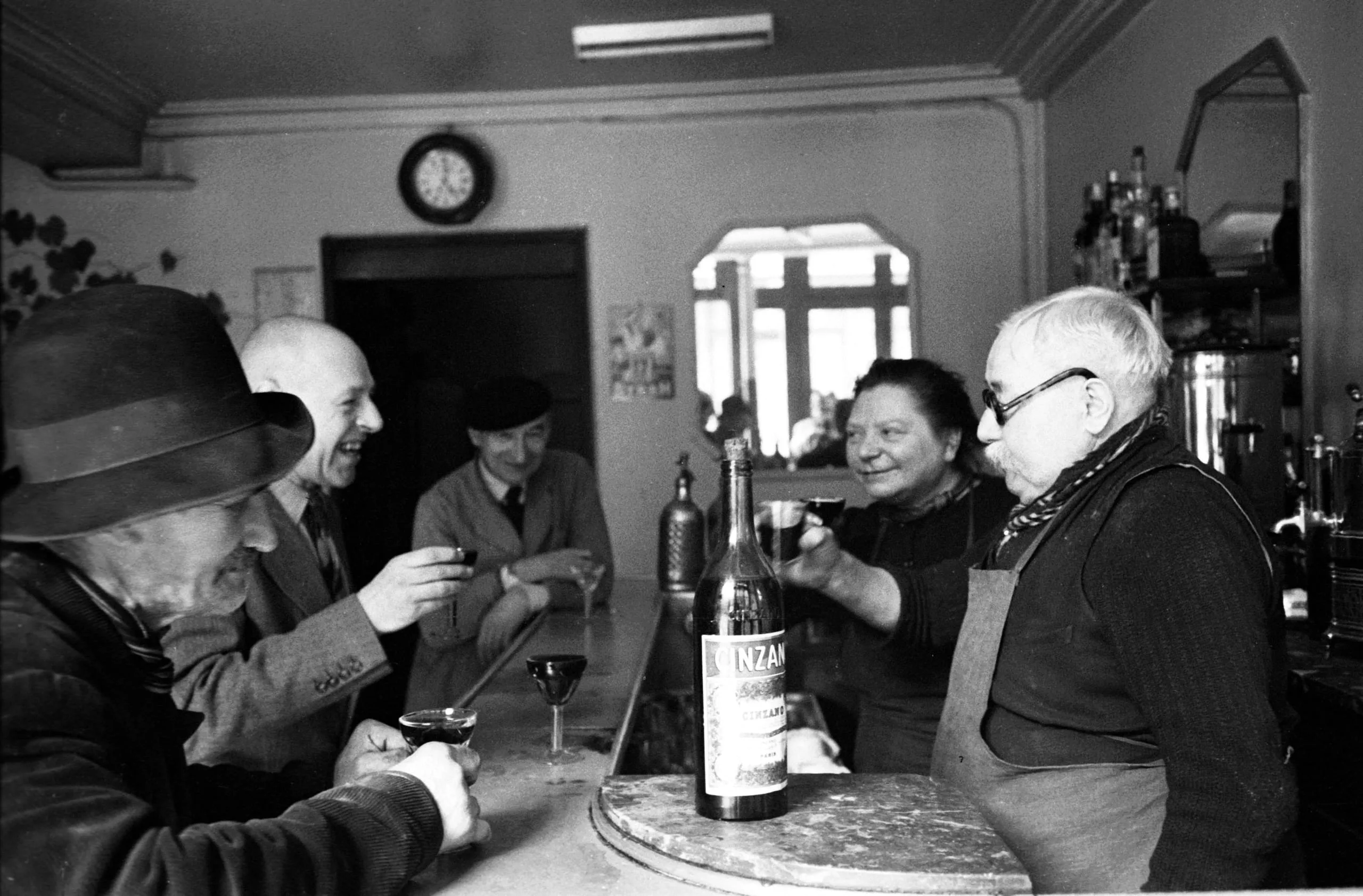 Black and white photograph of five people gathered around a bar counter, a large Cinzano bottle at center, glasses raised