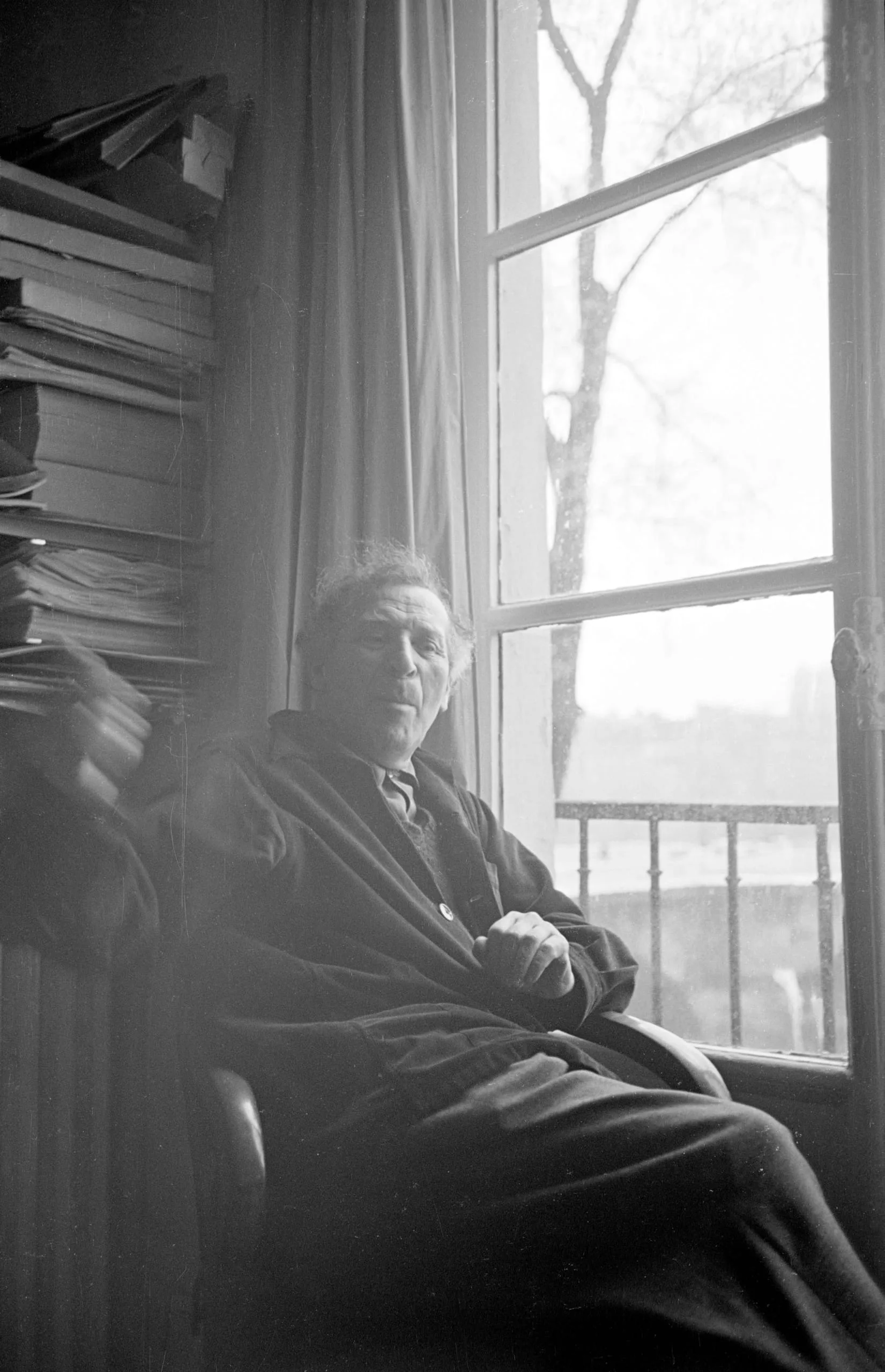 Black and white photograph, a middle-aged man seated in a chair beside a bright window, arms crossed, looking directly at the camera, stacks of papers visible behind him