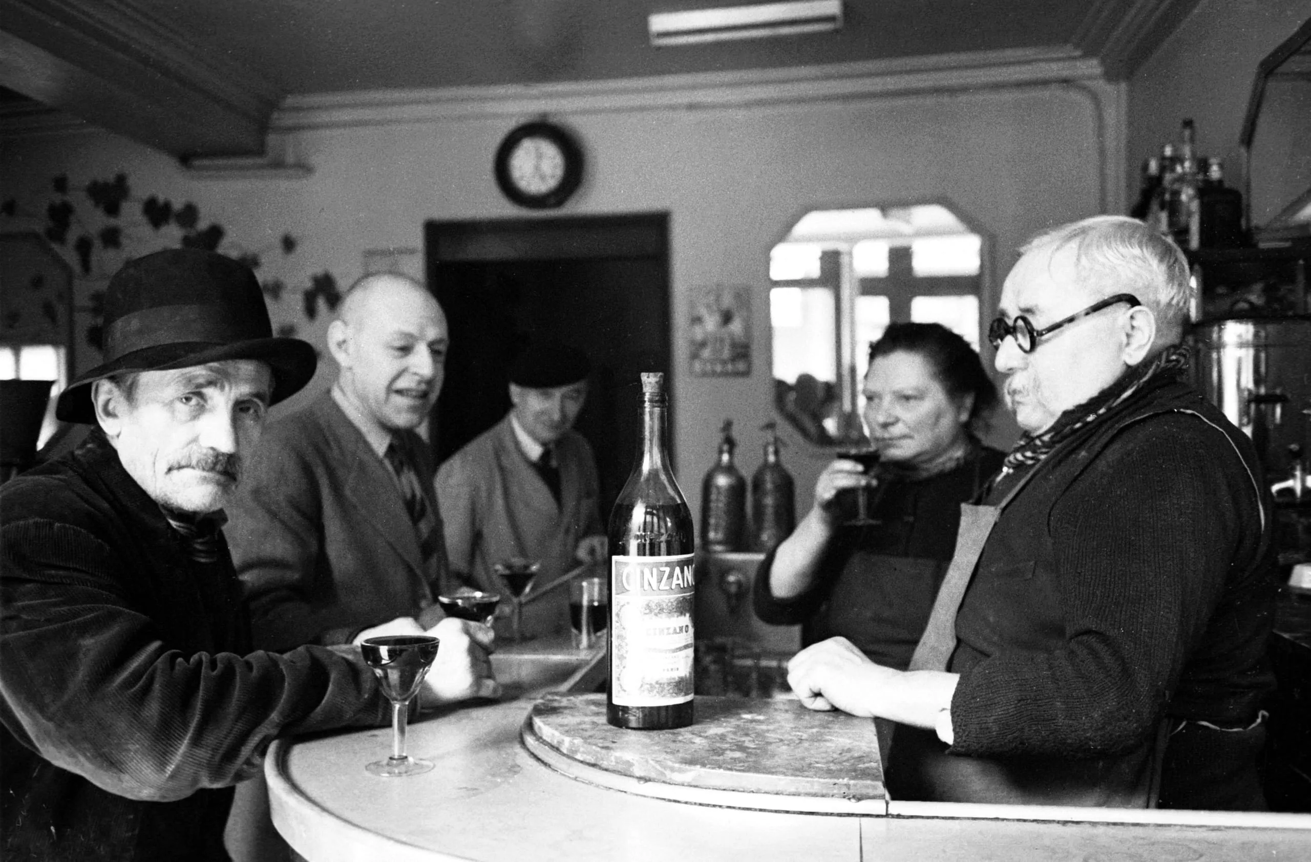 Black and white photograph of five people around a curved café bar, a Cinzano bottle at center, one man turning to face the camera