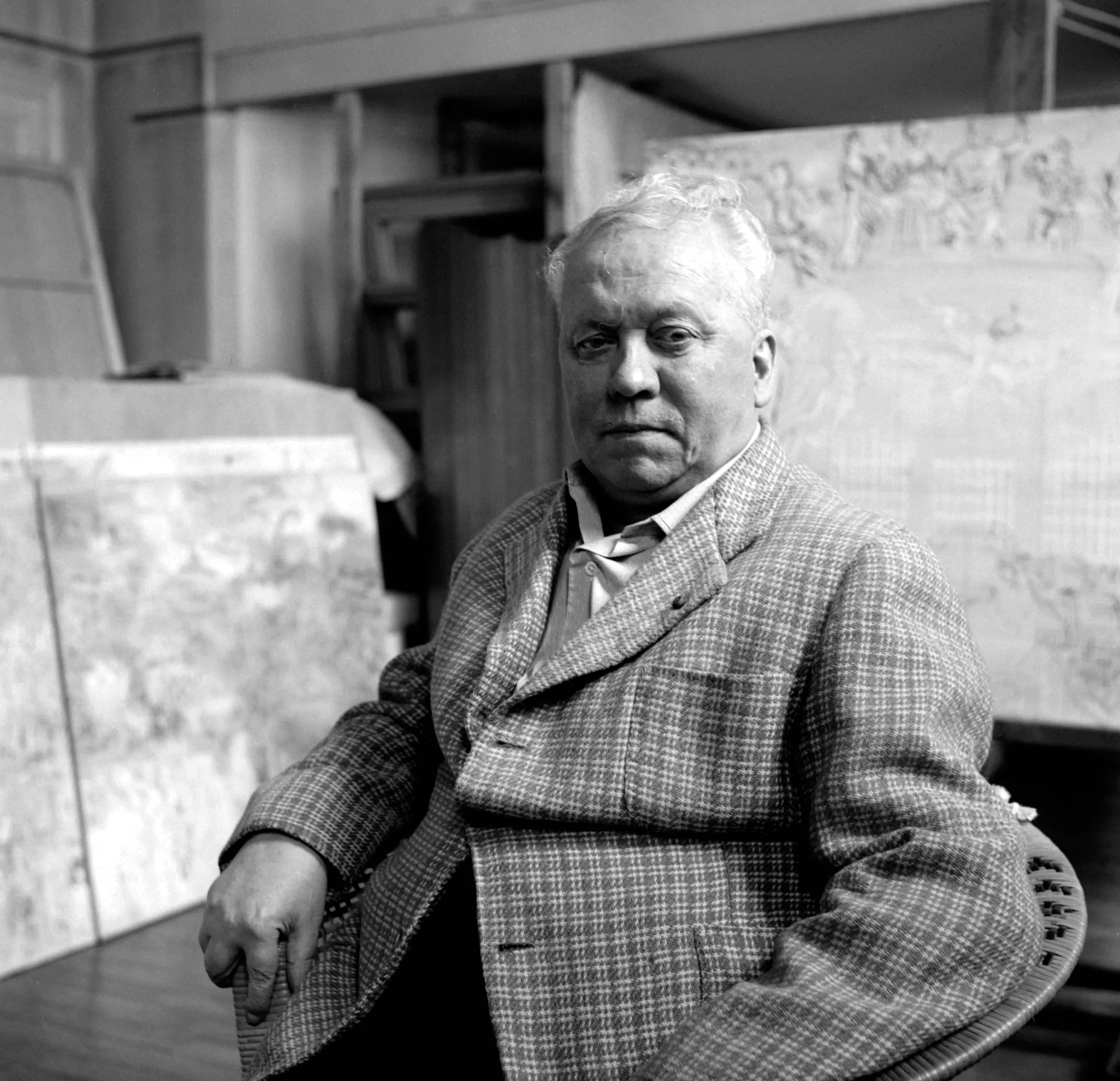Black and white photograph, heavyset man in plaid wool blazer seated in a chair, looking directly at camera, large painted canvases visible behind him in a studio setting