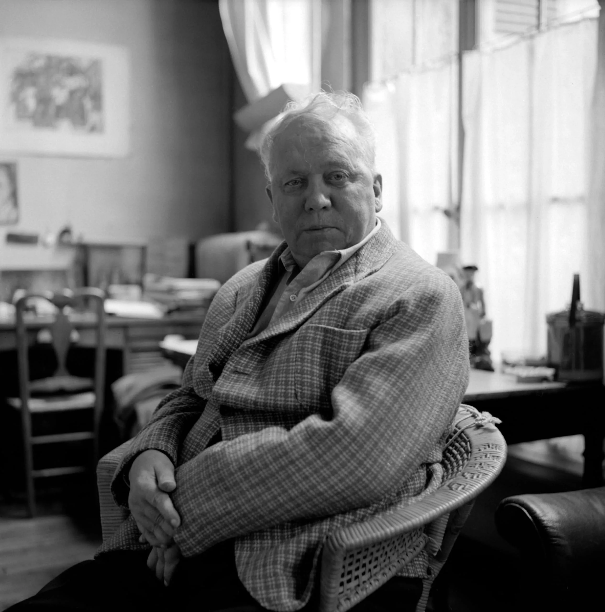Black and white photograph, heavyset white man with white hair seated in a wicker chair, arms crossed, looking directly at camera, interior room behind him out of focus