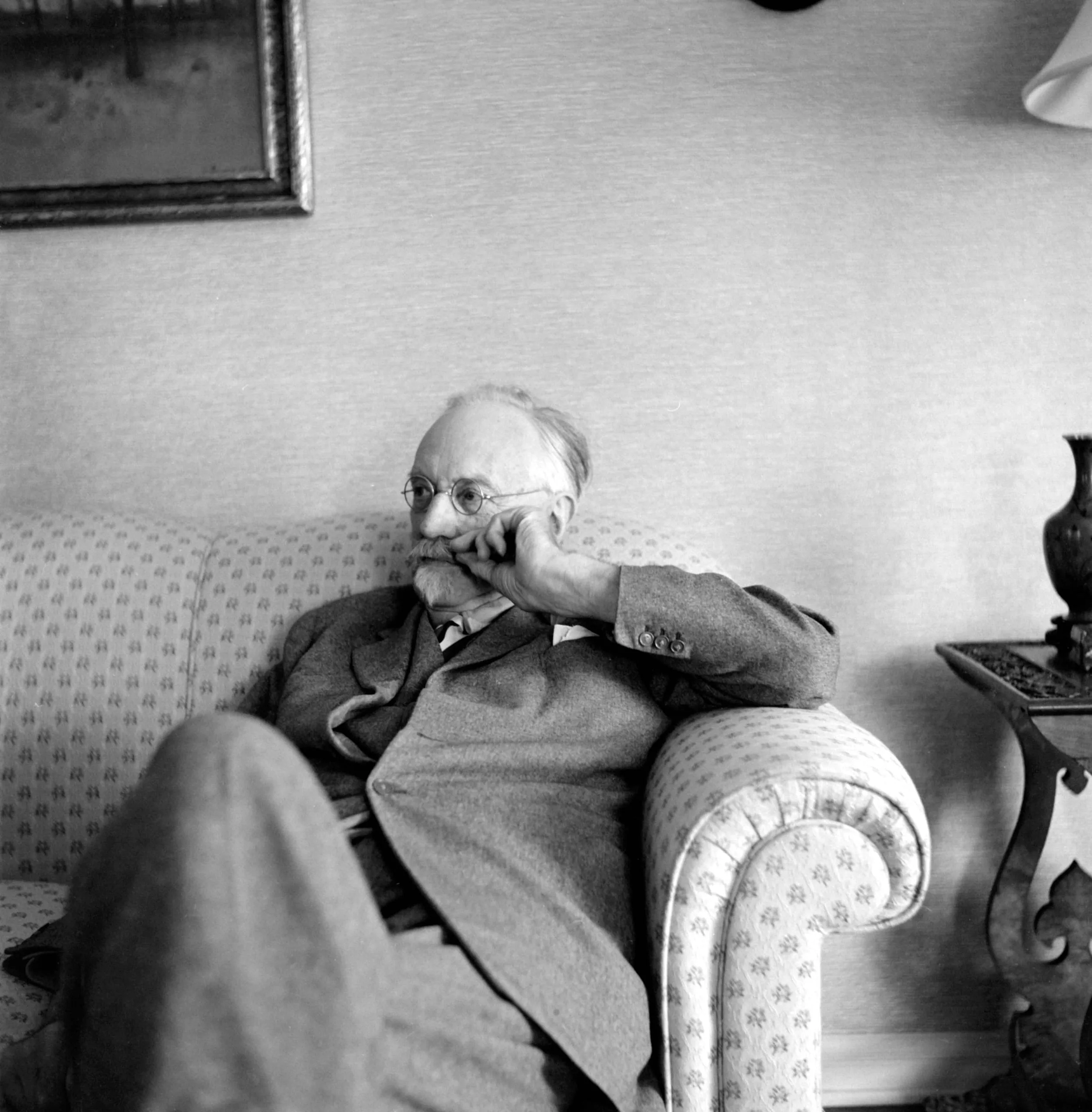 Black and white photograph of an elderly white man with wire-rimmed glasses and a mustache, reclining on a patterned sofa with his cheek resting on his fist
