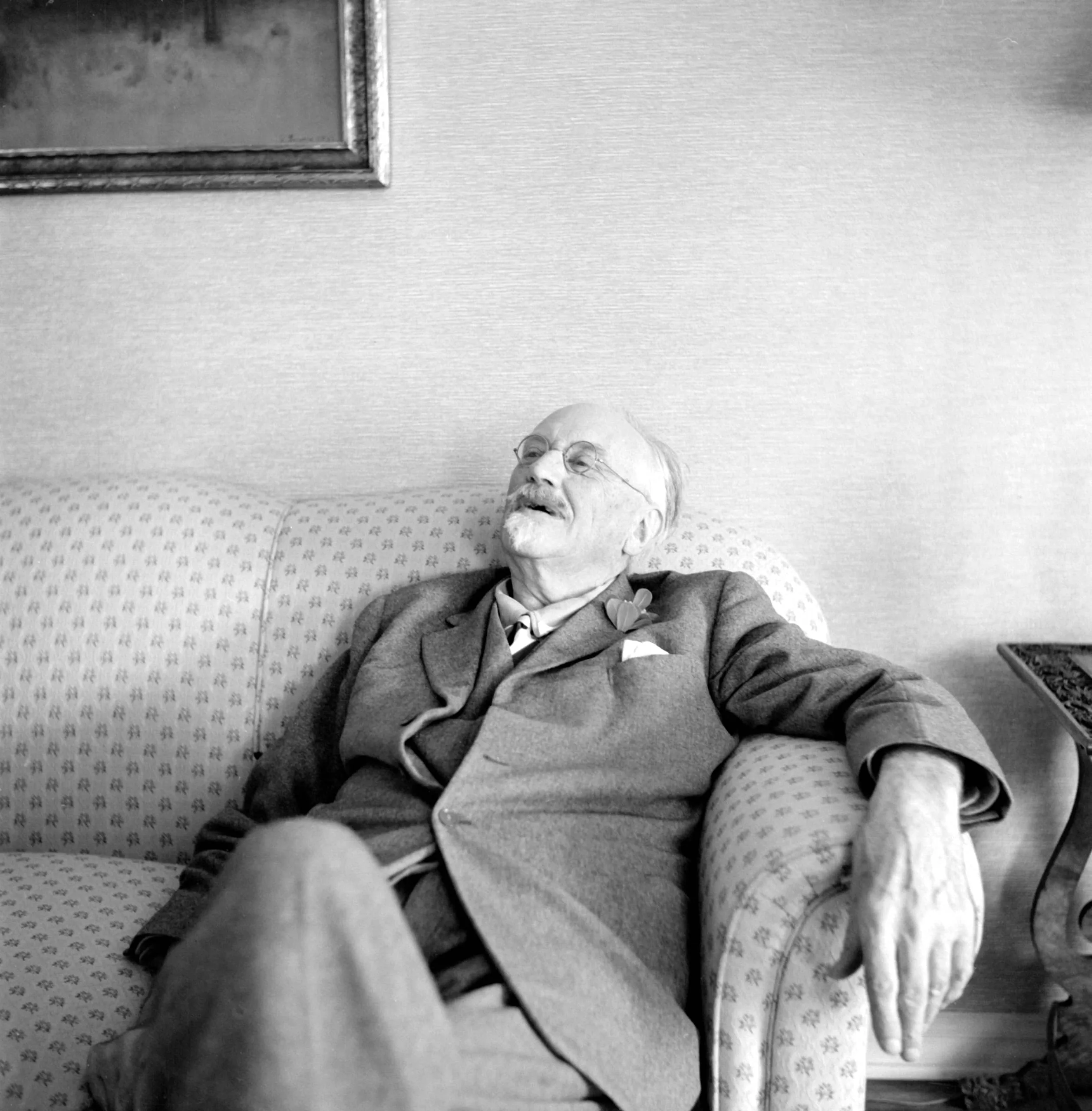 Black and white photograph of an elderly man reclining on a patterned sofa, head tilted back, wearing a suit with a boutonniere and wire-rimmed glasses