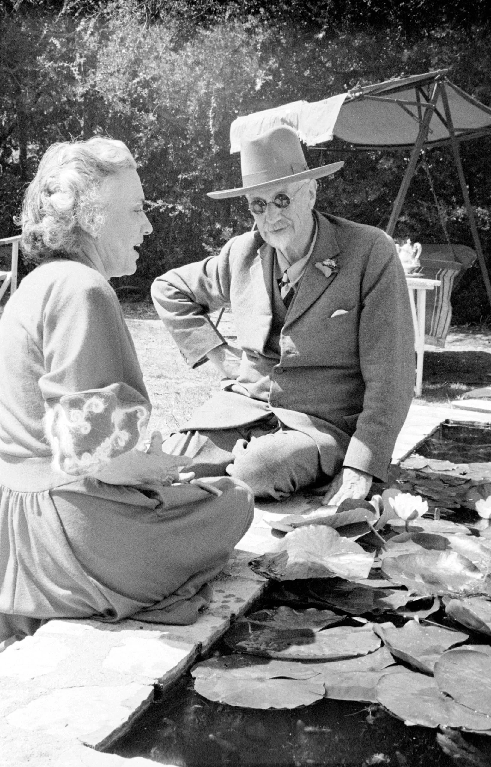 Black and white photograph of two people seated outdoors beside a lily pond with flat stone edging, conversing in bright sunlight