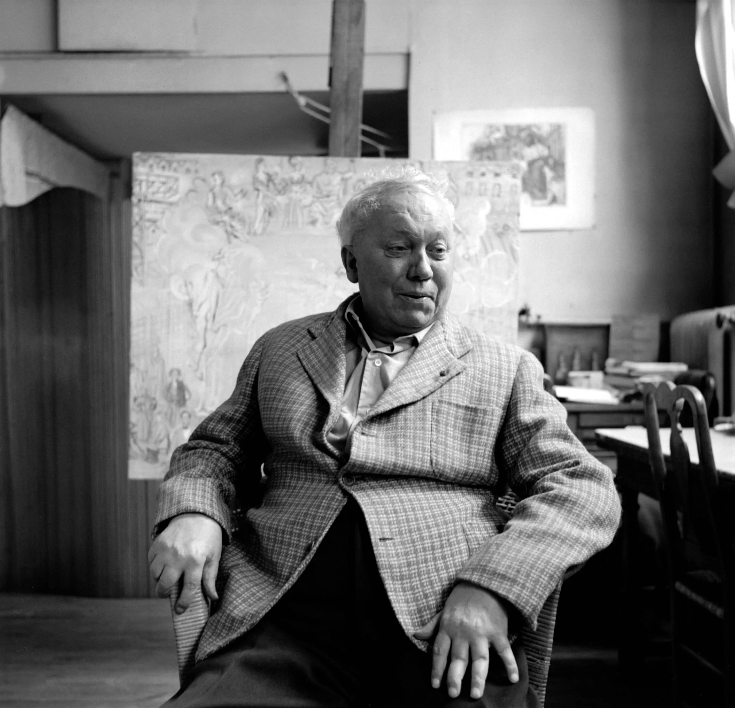 Black and white photograph of a heavyset white man with white hair, seated in a chair in a studio, wearing a plaid sport coat, with a large figural canvas visible behind him