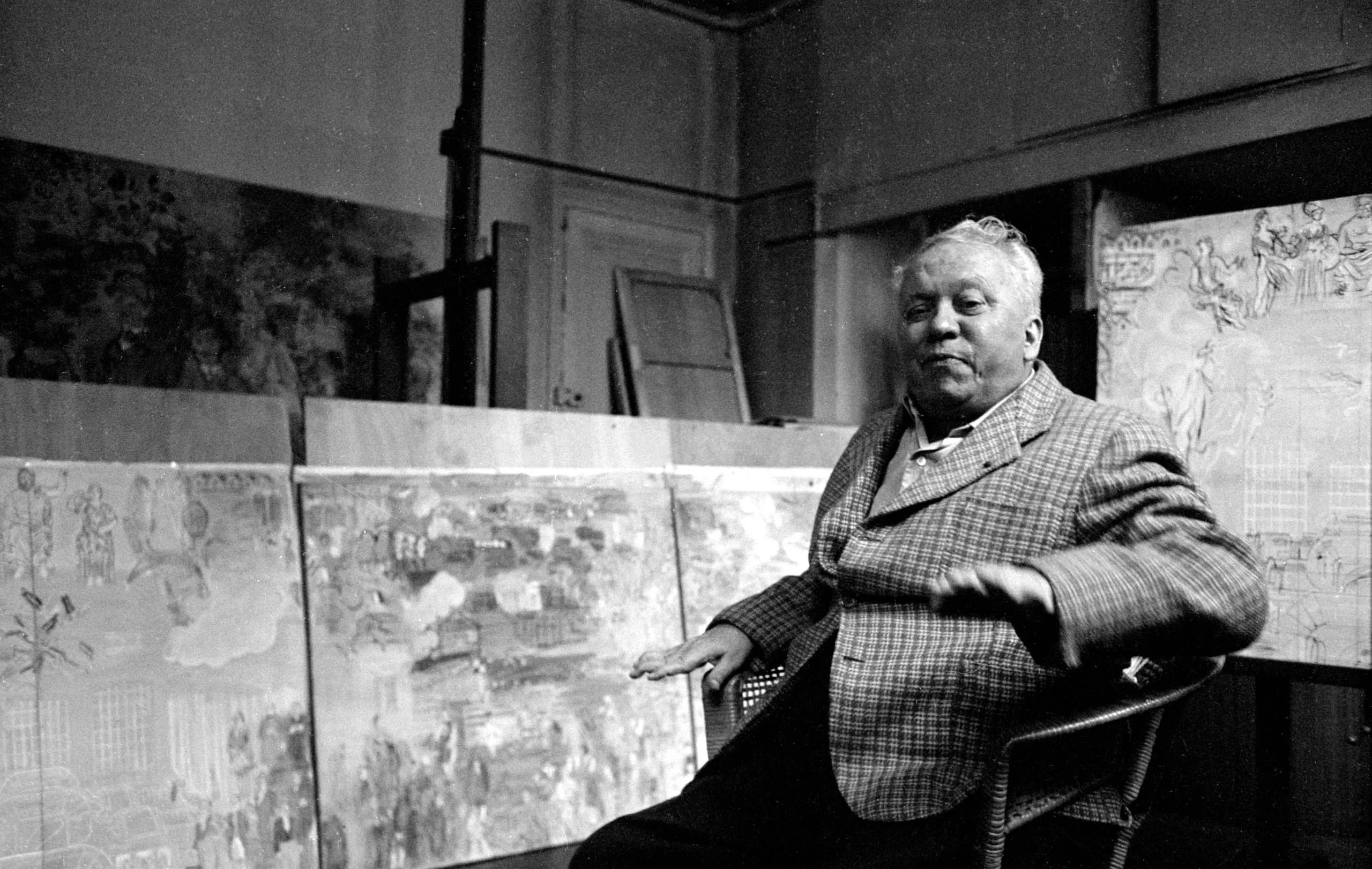 Black and white photograph of a heavyset man in a plaid jacket seated in a chair inside an artist's studio, surrounded by large painted canvases