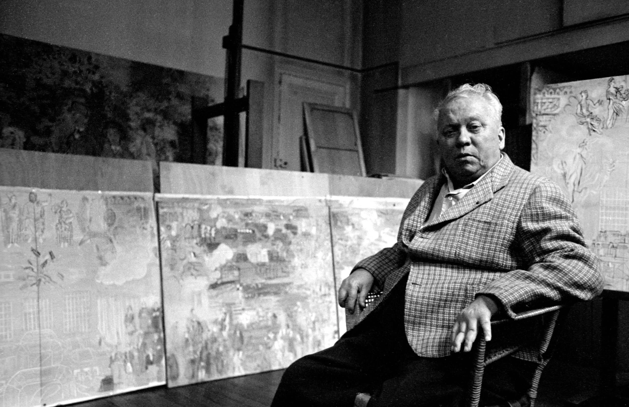 Black and white photograph of a heavyset man with brown skin seated in an artist's studio, wearing a plaid jacket, surrounded by large figurative paintings