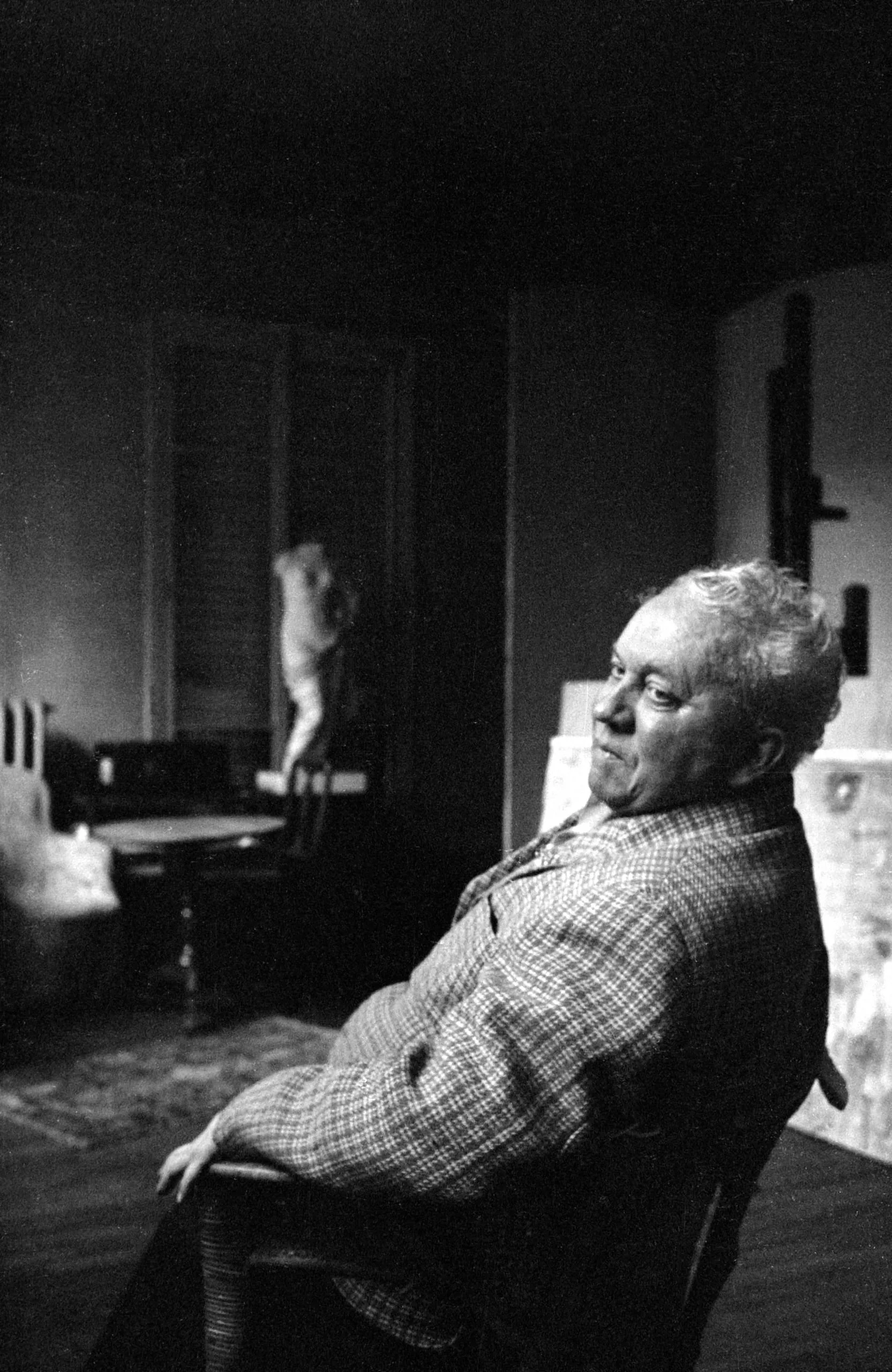 Black and white photograph of a heavyset man seated in a wooden chair, three-quarter profile, arms folded, wearing a plaid sport coat, with a dim interior room and small figurine visible behind him
