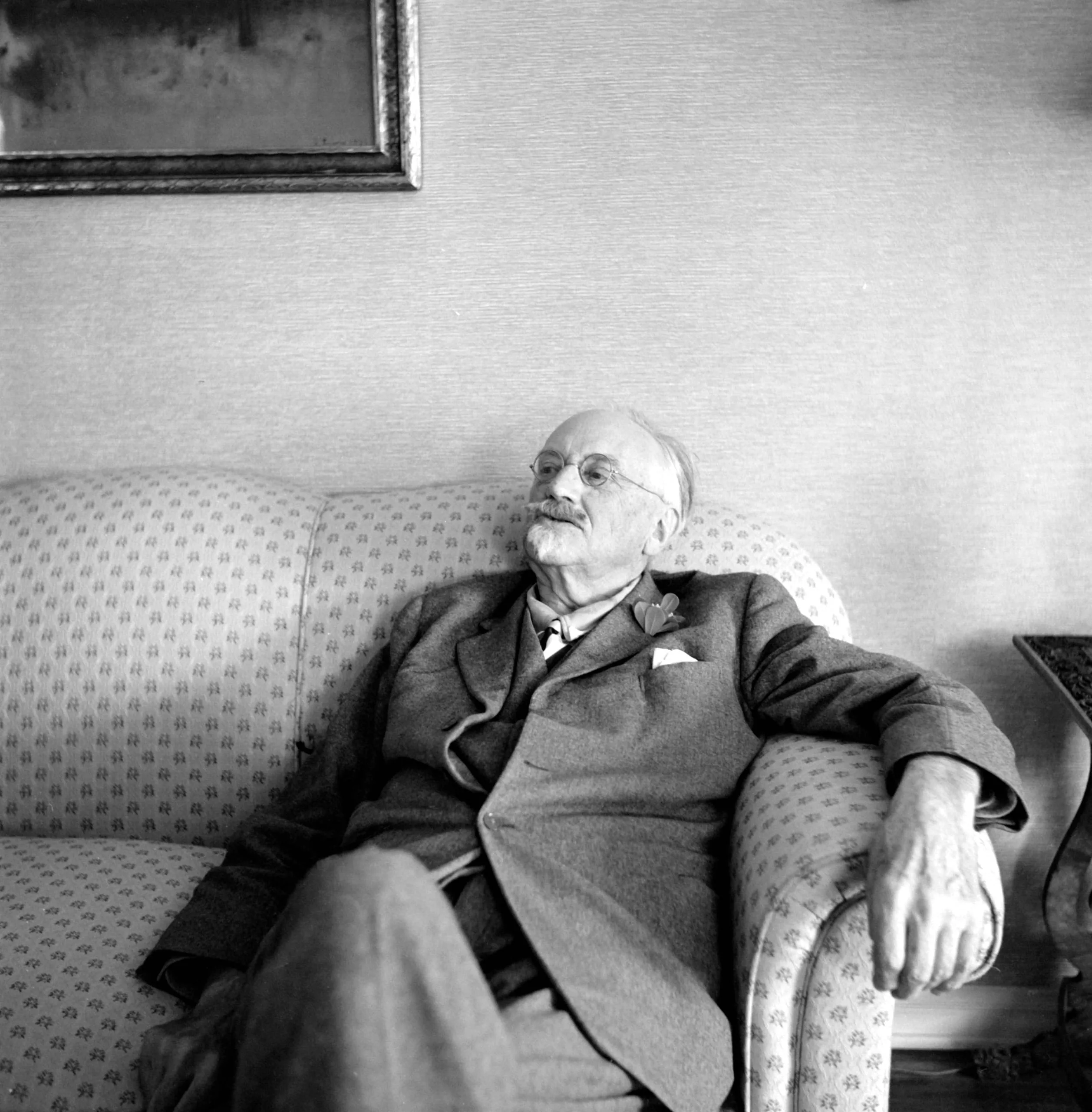Black and white photograph of an elderly white man in a suit reclining on a patterned sofa, head tilted back, wearing round wire-framed glasses