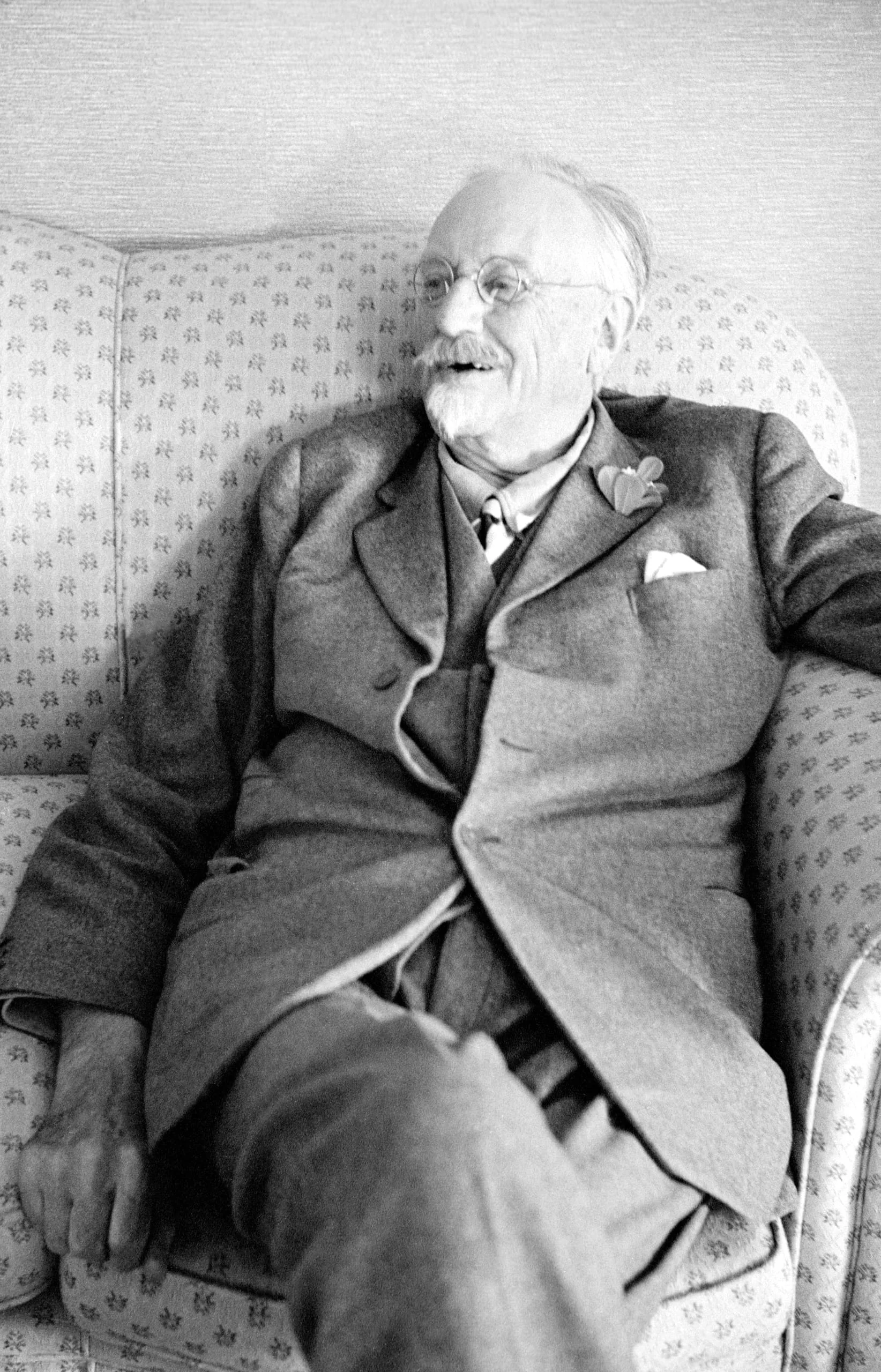Black and white photograph of an elderly white man with round glasses and a white goatee, seated in a floral armchair, mouth open, wearing a dark suit with a flower pinned to the lapel