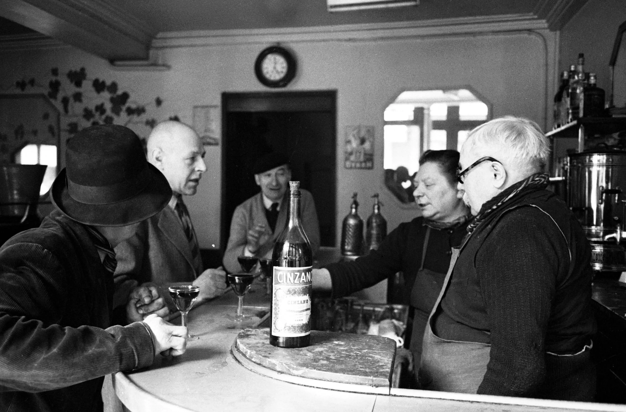 Black and white photograph of four people gathered around a small round café table with a Cinzano bottle and wine glasses, interior setting