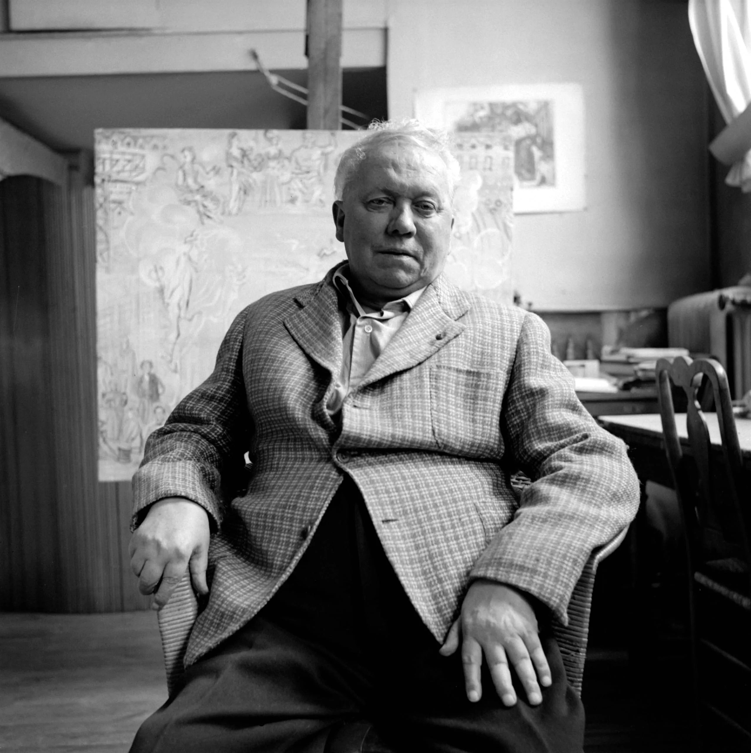 Black and white photograph, heavyset white-haired man seated facing camera in a plaid sport coat, a large figure study on canvas visible behind him in what appears to be an artist's studio