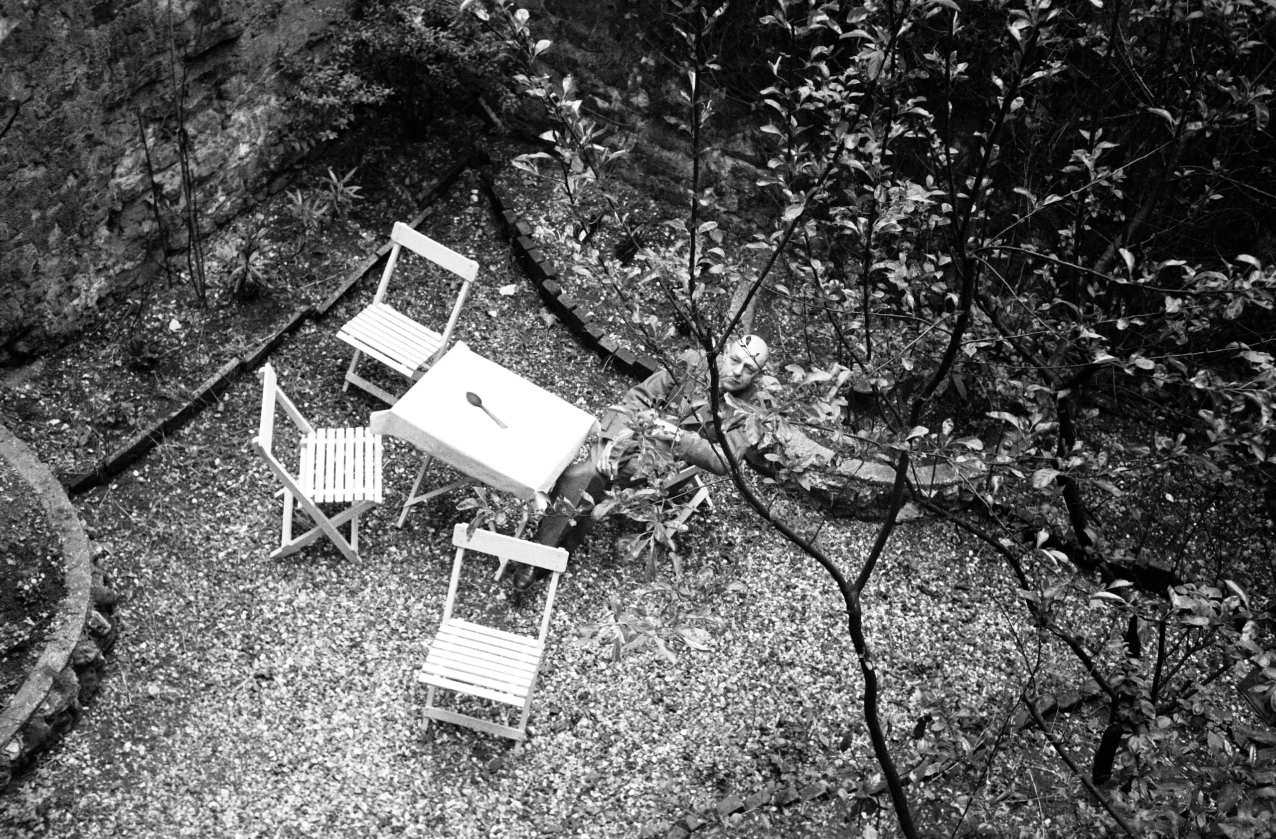 Black and white photograph shot from directly above, showing a gravel courtyard with three white folding chairs, a small white table, and a person lying on the ground partially hidden beneath leafy shrubs