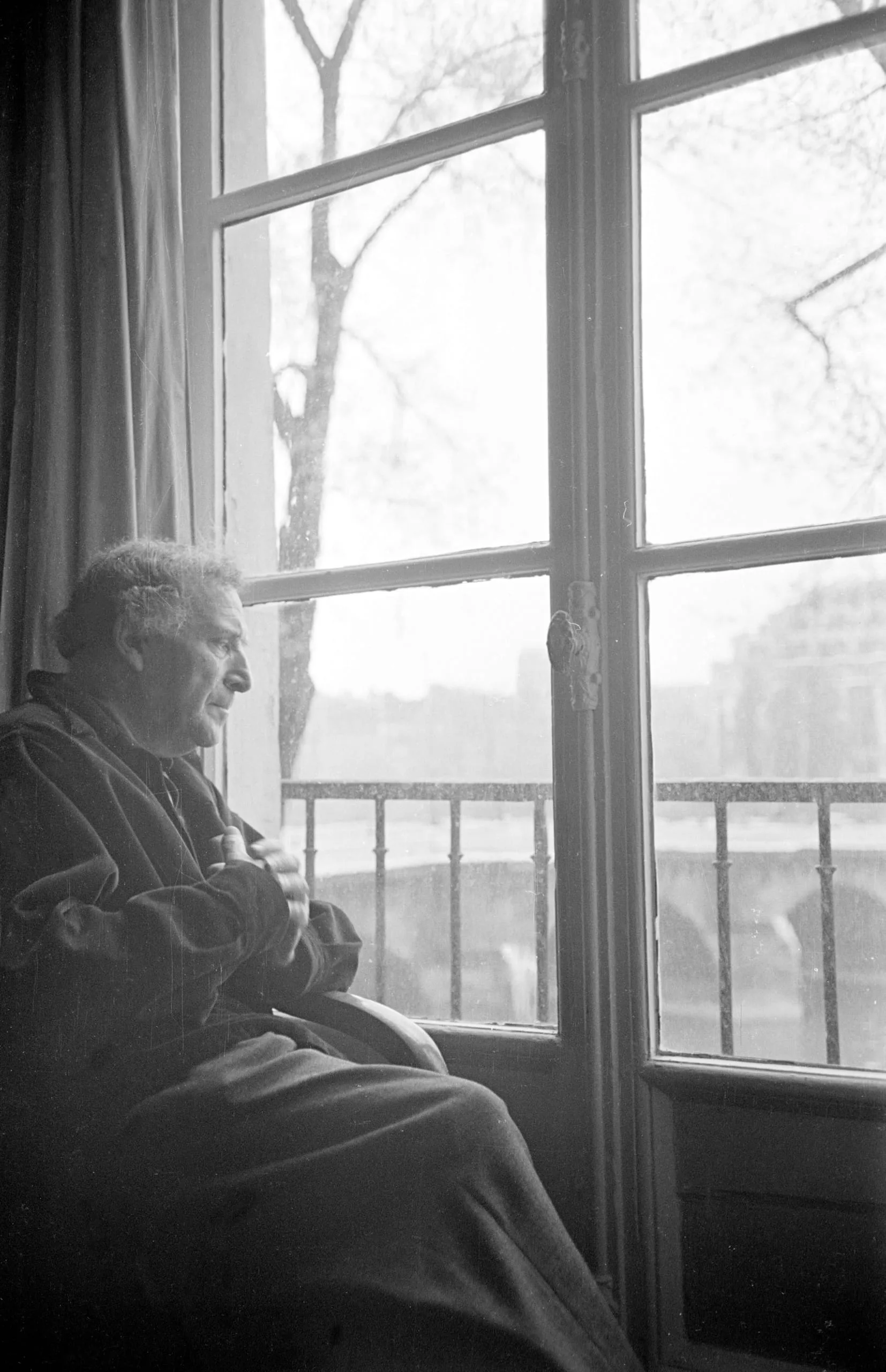 Black and white photograph of a man with gray hair seated in left profile beside a multi-paned window, arms folded, soft diffused light, bare trees visible outside