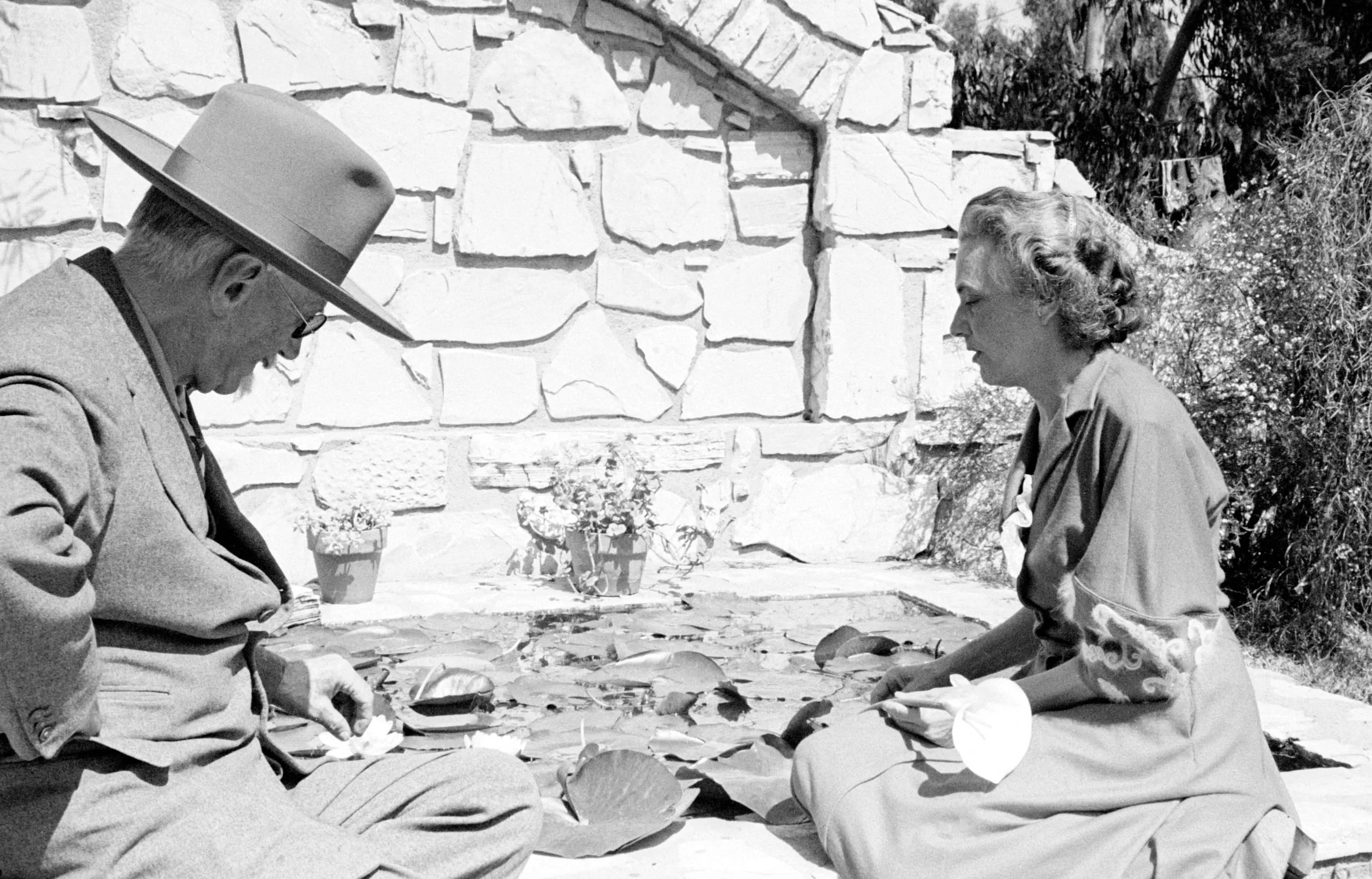 Black and white photograph of a man in a wide-brimmed hat and a woman with curly hair seated outdoors facing each other across large round leaves, with a stone wall behind them