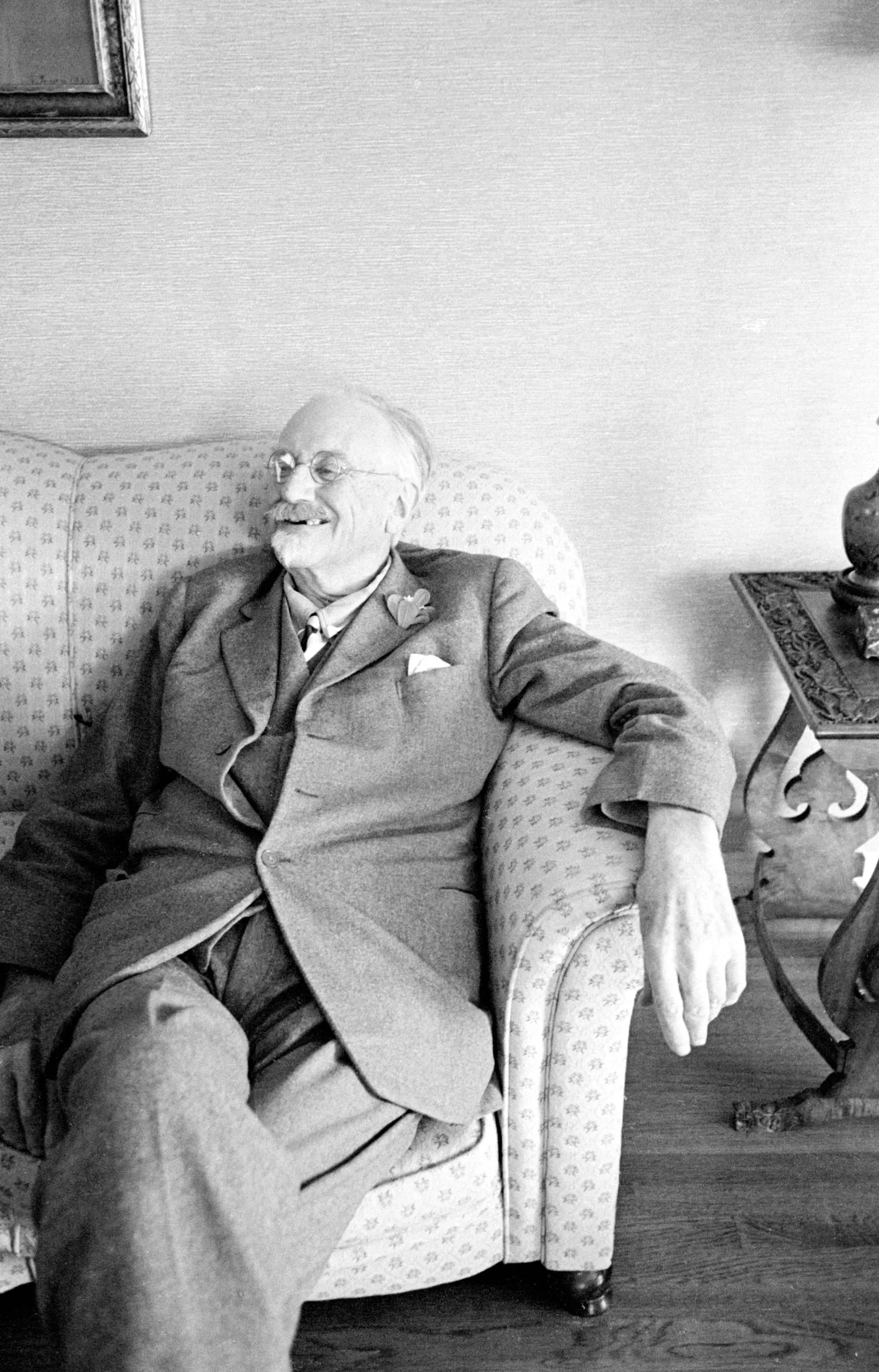 Black and white photograph of an older white man in a three-piece suit and bow tie, seated in a floral armchair, head tilted back with mouth open