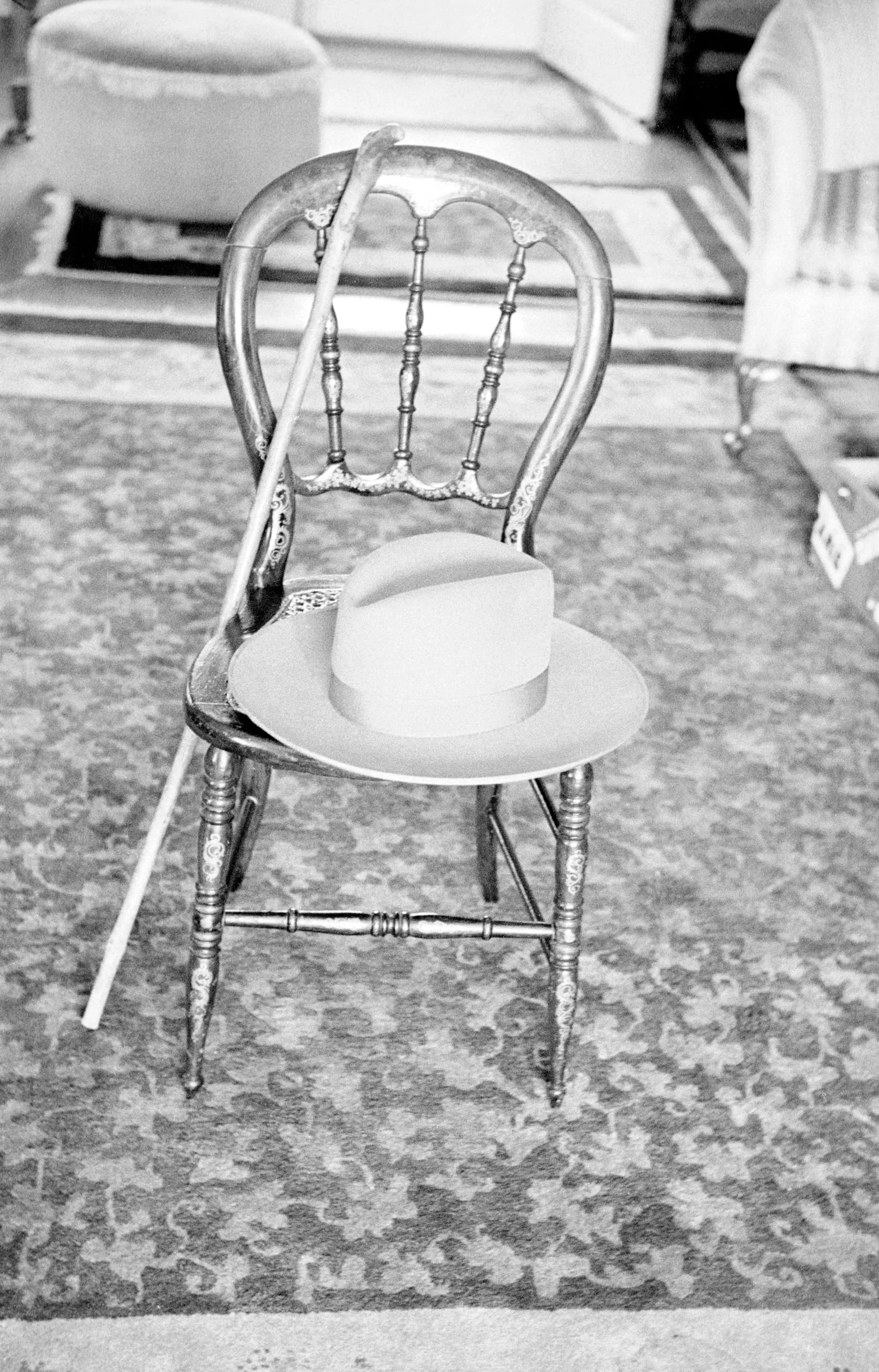 Black and white photograph of an ornate Victorian-style parlor chair on a floral rug, with a wide-brimmed hat resting on the seat and a cane leaning across the back