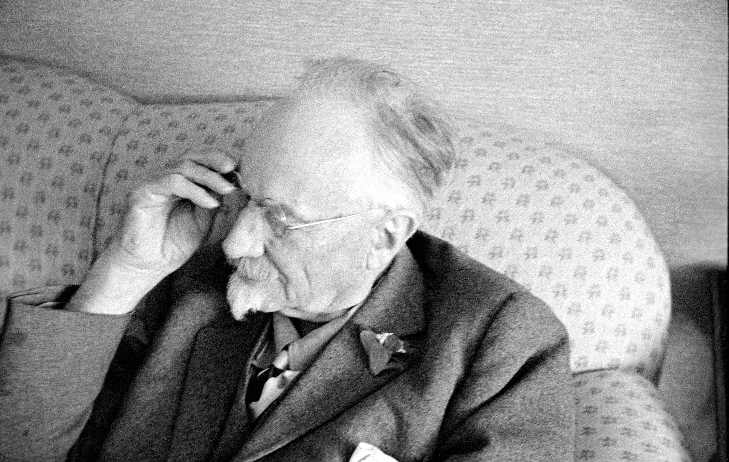 Black and white photograph of an elderly white man with white hair and glasses seated on a floral-patterned sofa, head bowed and hand raised to his temple