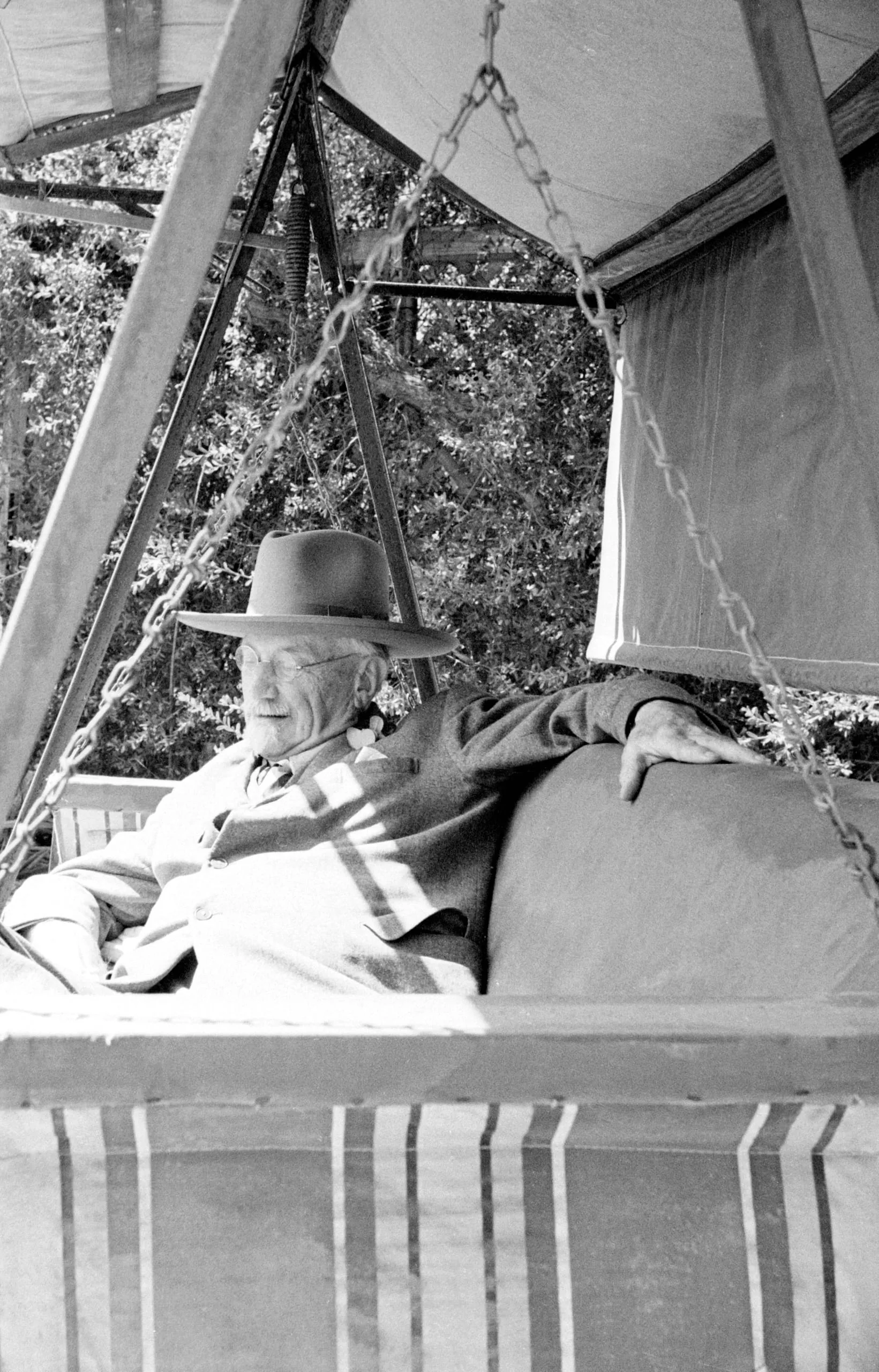 Black and white photograph of an elderly man in a wide-brimmed hat reclining in a canopied outdoor hanging swing, shot from below against a backdrop of leafy trees