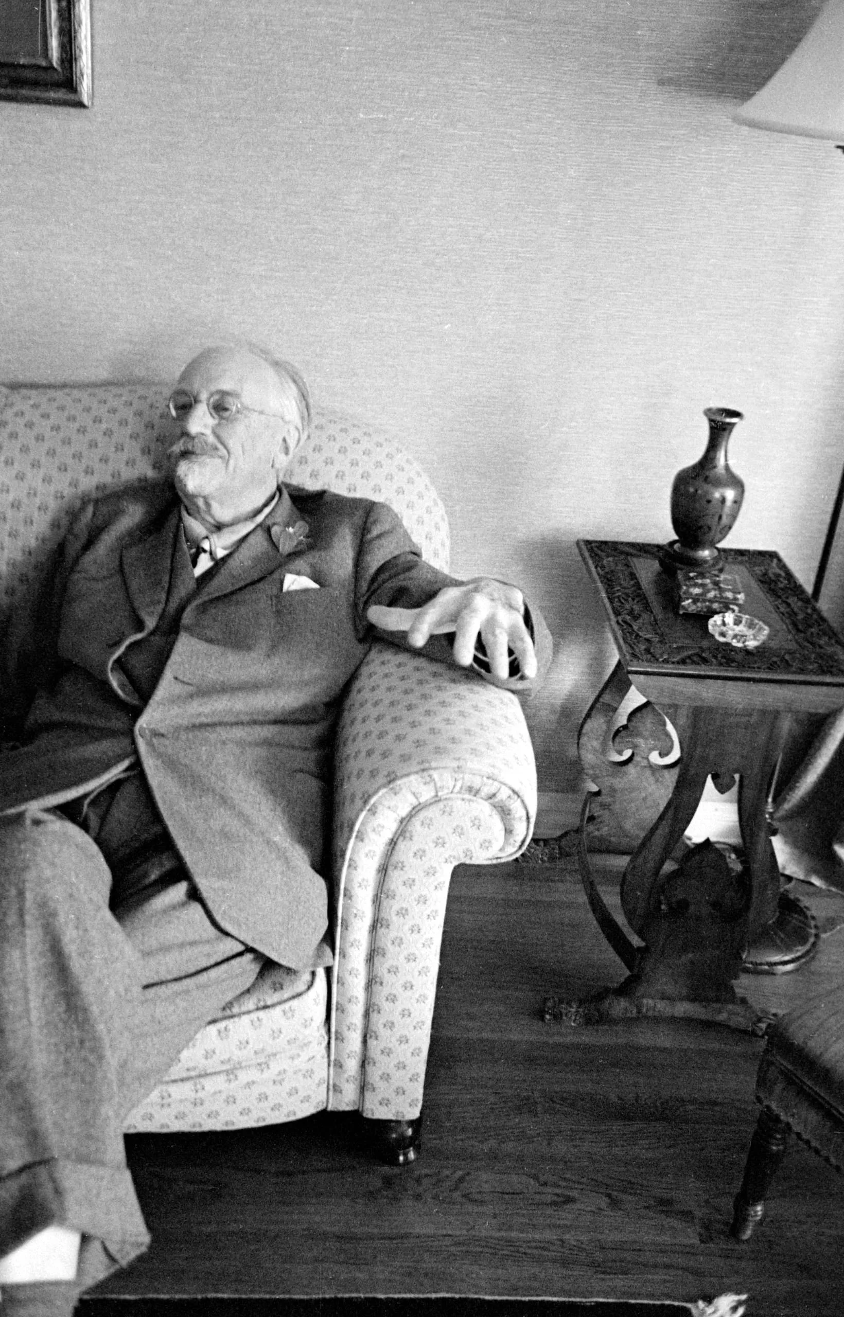 Black and white photograph of an elderly man in a suit and bow tie reclining in a patterned armchair, head tilted back, gaze directed upward