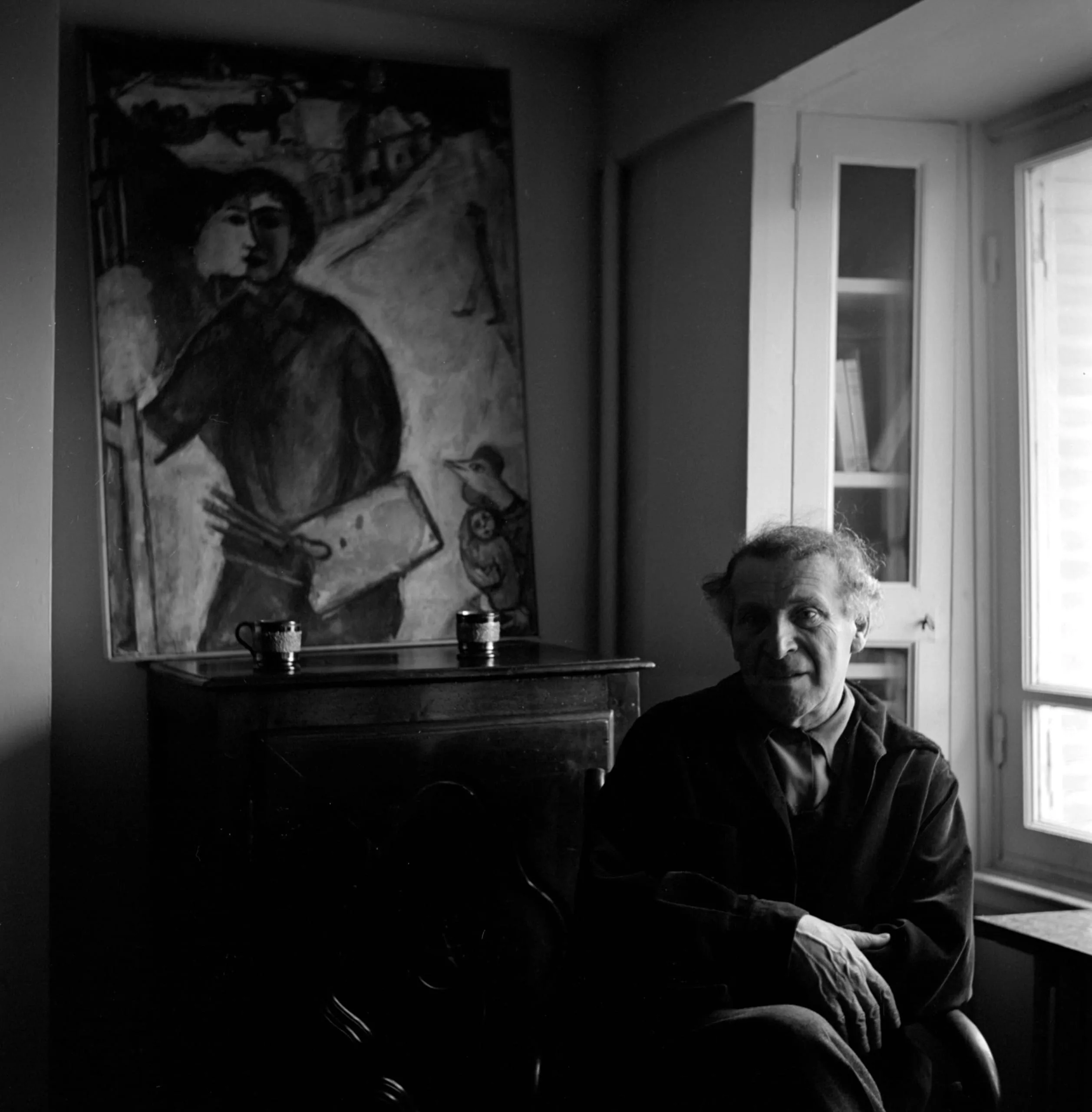 Black and white photograph of an elderly man seated in a dimly lit room, lit from the right, with a large figurative painting hanging on the wall behind him