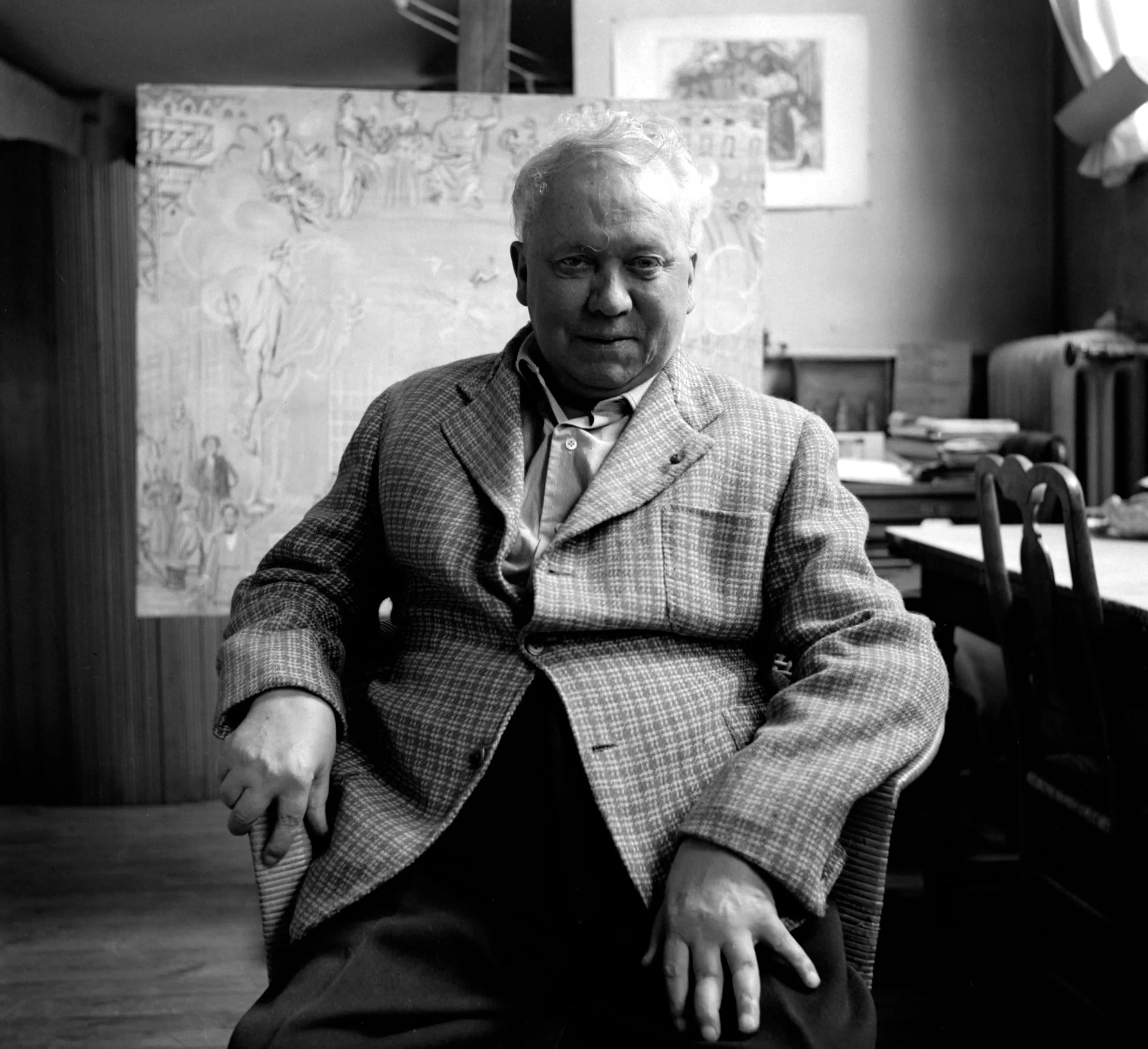 Black and white portrait photograph of a heavyset man with white hair seated in a studio, a large figurative mural sketch visible behind him