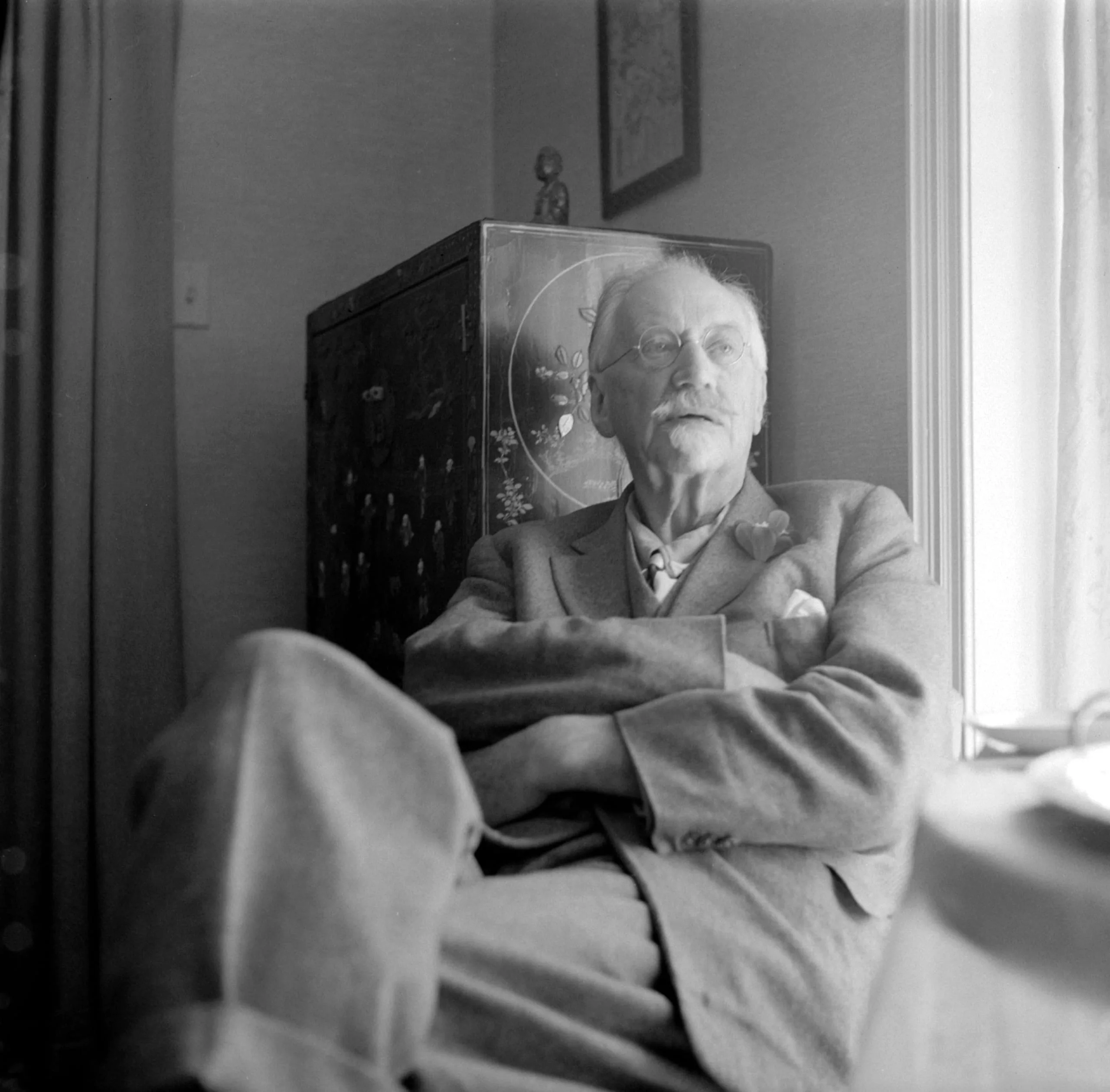 Black and white photograph of an elderly man seated in a chair, arms crossed, with a dark lacquered cabinet directly behind his head, soft window light from the right