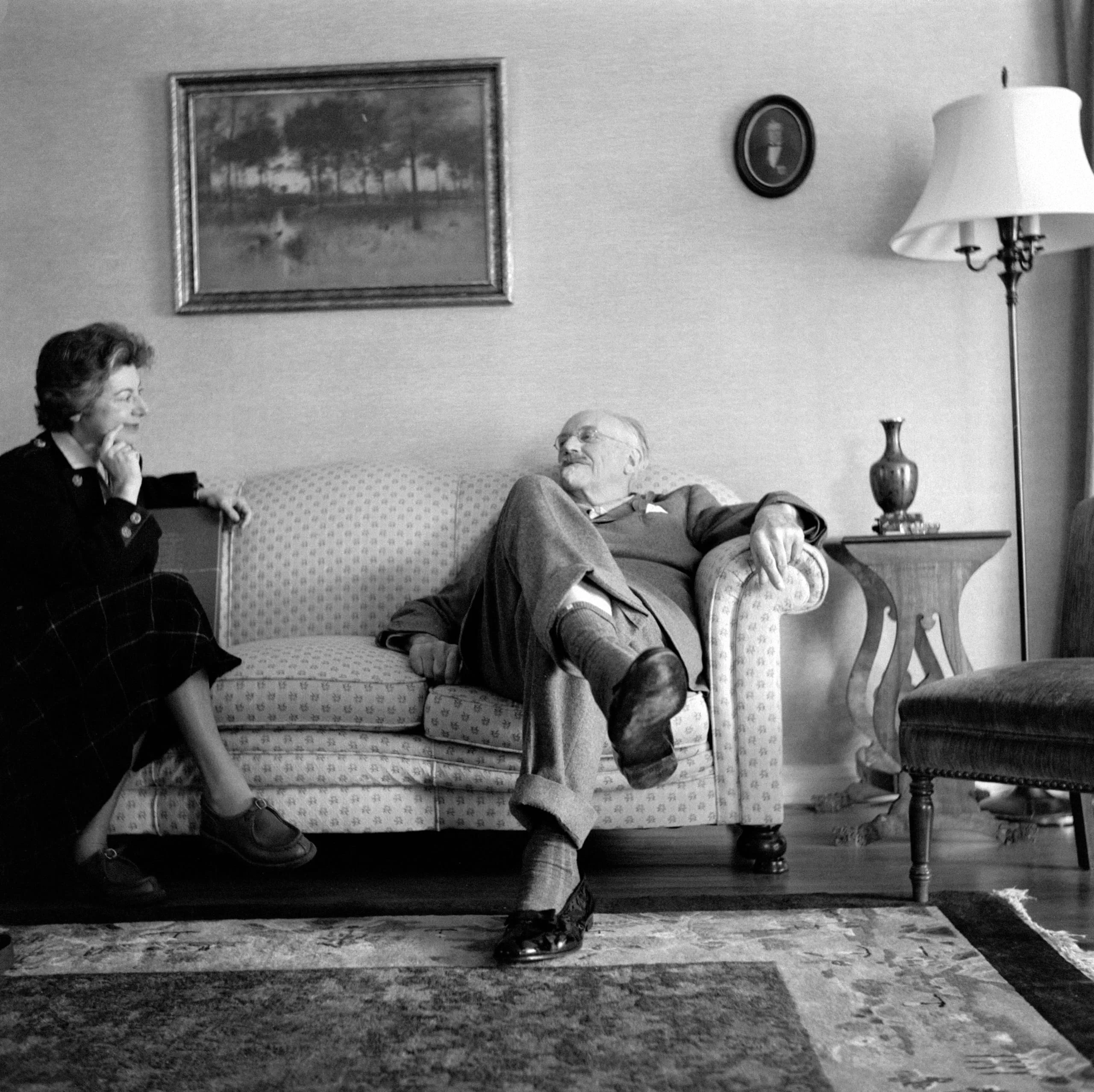 Black and white photograph of a man and woman seated on a sofa in a living room, with a framed landscape painting on the wall behind them