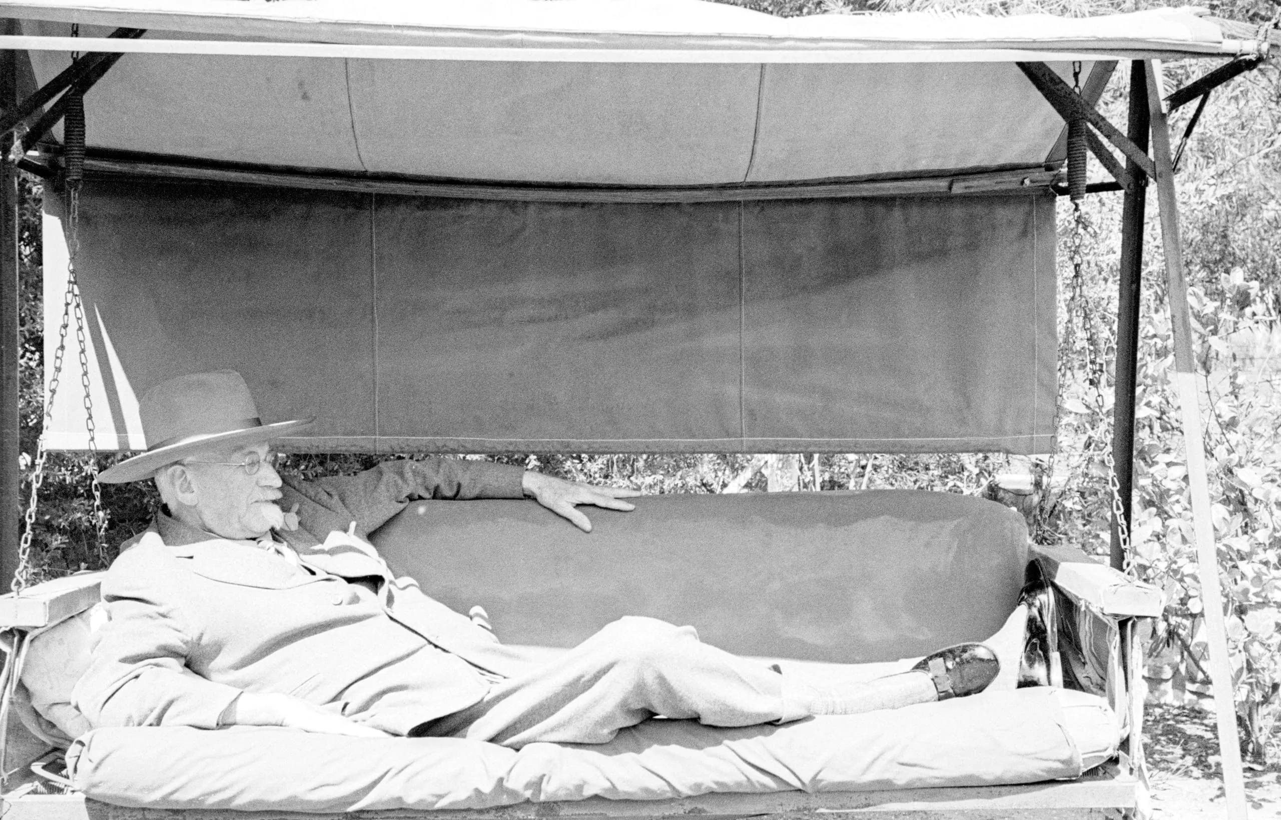 Black and white photograph of a man in a wide-brimmed hat reclining on a canopied outdoor daybed, legs extended, leafy trees in the background