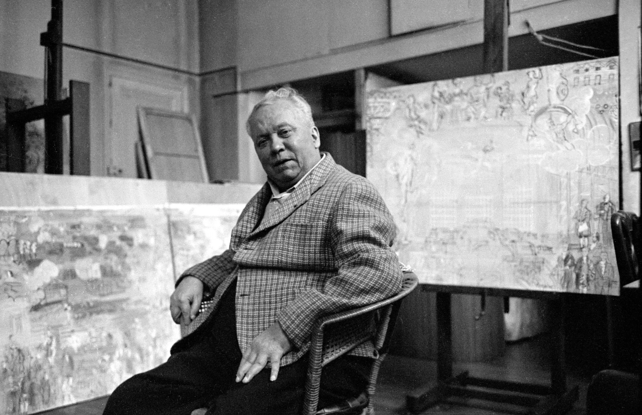 Black and white photograph of a heavyset man seated in a wooden chair in an art studio, surrounded by large paintings, holding a cigarette