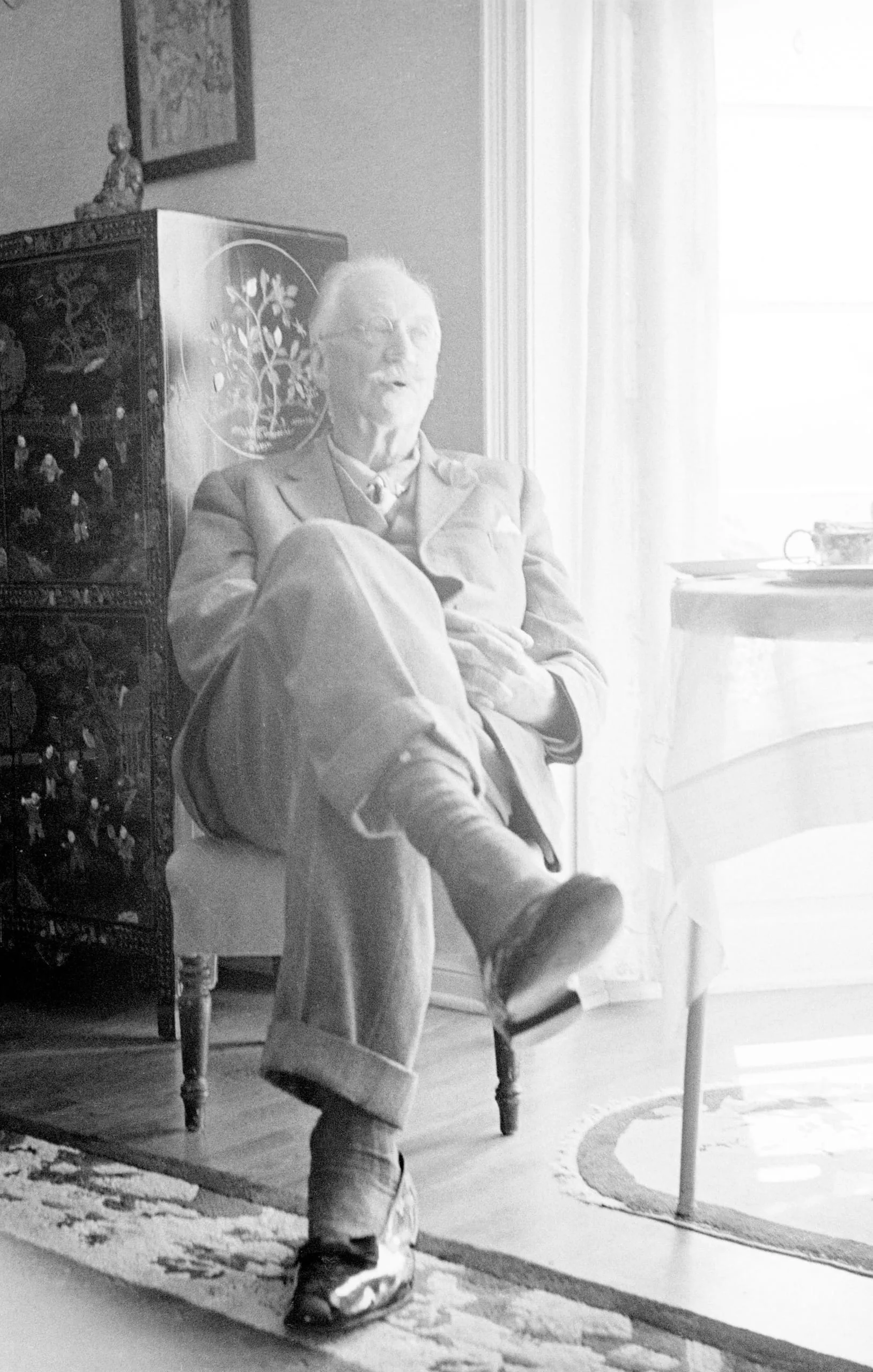 Black and white full-length photograph of an elderly man in a suit seated in an armchair, legs crossed, looking toward a bright window, with a carved dark cabinet behind him