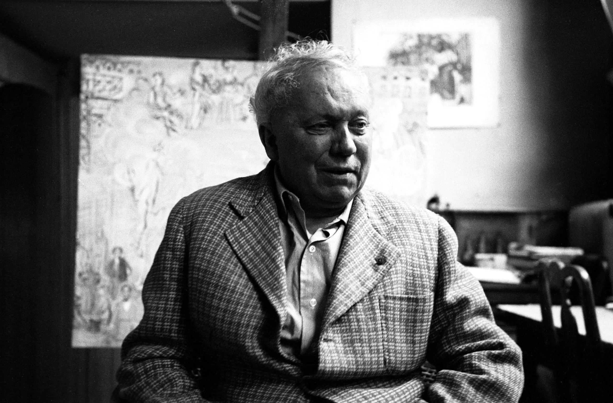 Black and white portrait photograph, heavyset man with white hair in a plaid sport coat, seated in three-quarter view, with large sketched canvas visible behind him