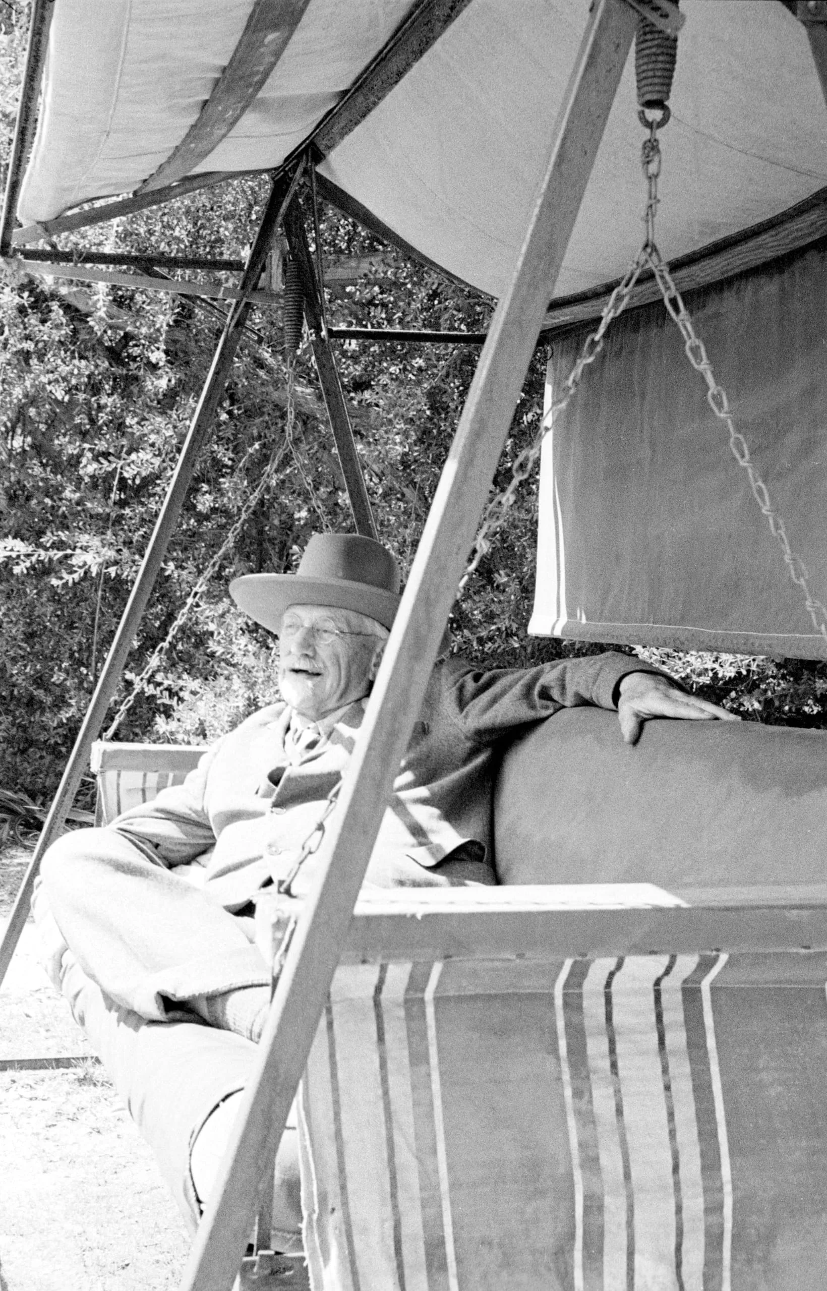 Black and white photograph of an older man in a wide-brimmed hat reclining on an outdoor canvas-covered swing, legs outstretched, mouth open